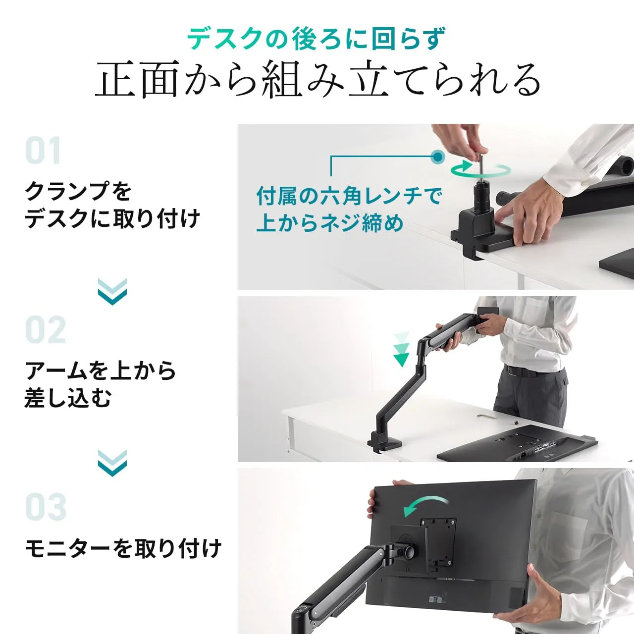 に対応し、上下・前後・左右の自在な調整が可能です。ロングリーチ設計により、奥行きのある デスク や ワイドモニター