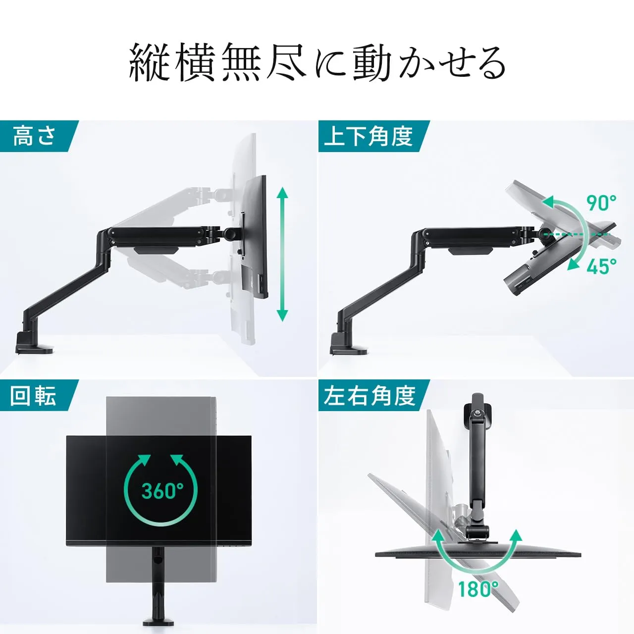 ・左右に角度調整でき、360°回転にも対応。 縦 画面でも使用できます。ケーブルクリップ付きで、配線をすっきり整理できます。クランプ ・ グロメット