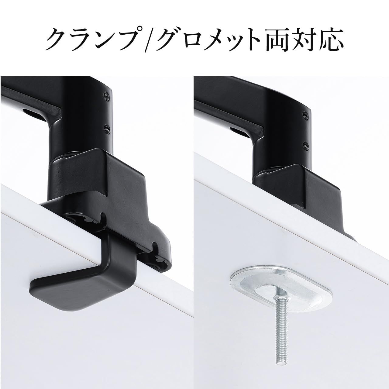 両対応で、設置環境に合わせて取り付け方法を選べます。クランプ部は出っ張りを抑えたスリム設計で、設置制限が少なく省スペースです。モニター の取り付けは VESA
