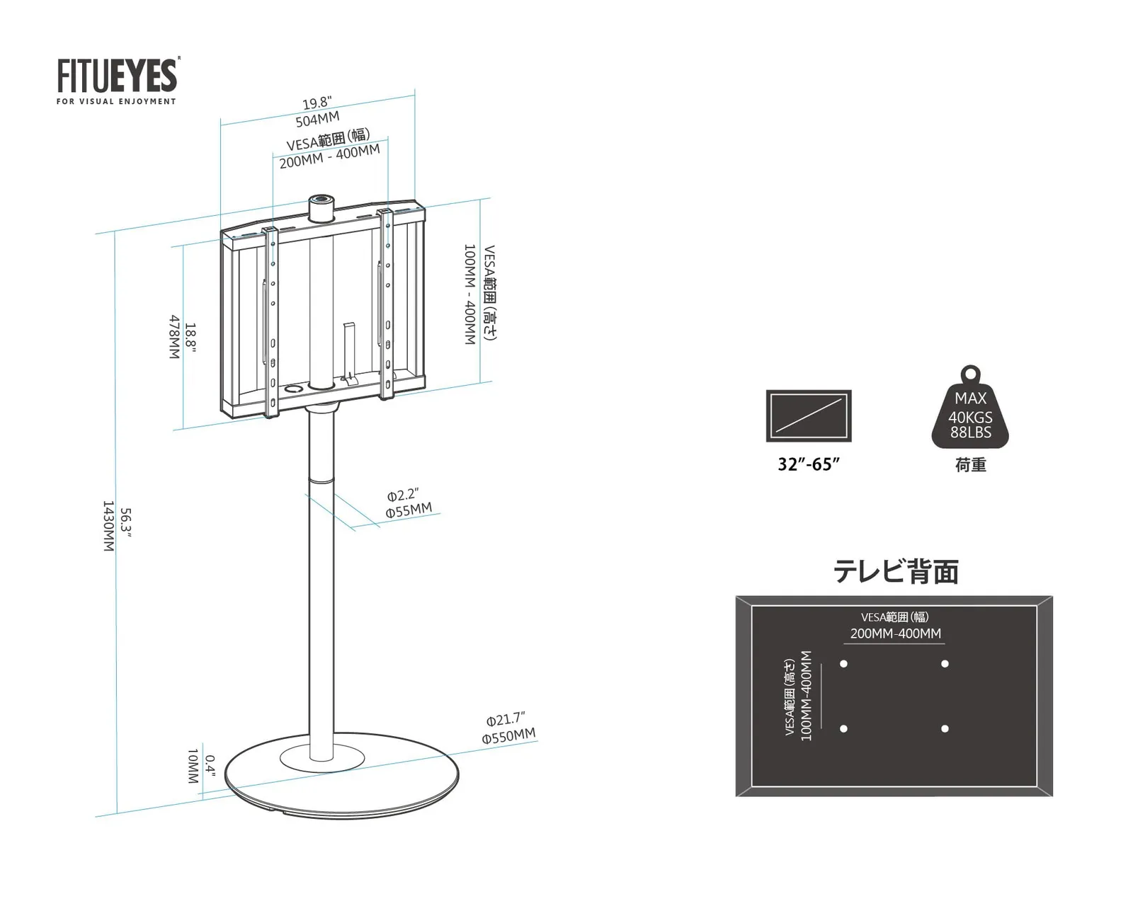 【商品仕様】本体サイズ(約):幅550mm×奥行550mm×高1430mm、底面サイズ(円型)/直径55cm。本体重量:14.5kg、耐荷重:40kg。テレビスタンド対応されるVESA規格の最大限は200(w)*100(h)mmから400(w)mmx400(h)mmまでです。37~65インチのテレビやモニターには最推薦だけど、サポート範囲内のテレビは取り付け可能でございます。 最後までご確認頂き誠にありがとうございました。 上記をご確認頂き、ご購入いただけましたら幸いです。 何かご不明な点がございましたらお気軽にメッセージからお問い合わせ下さい。