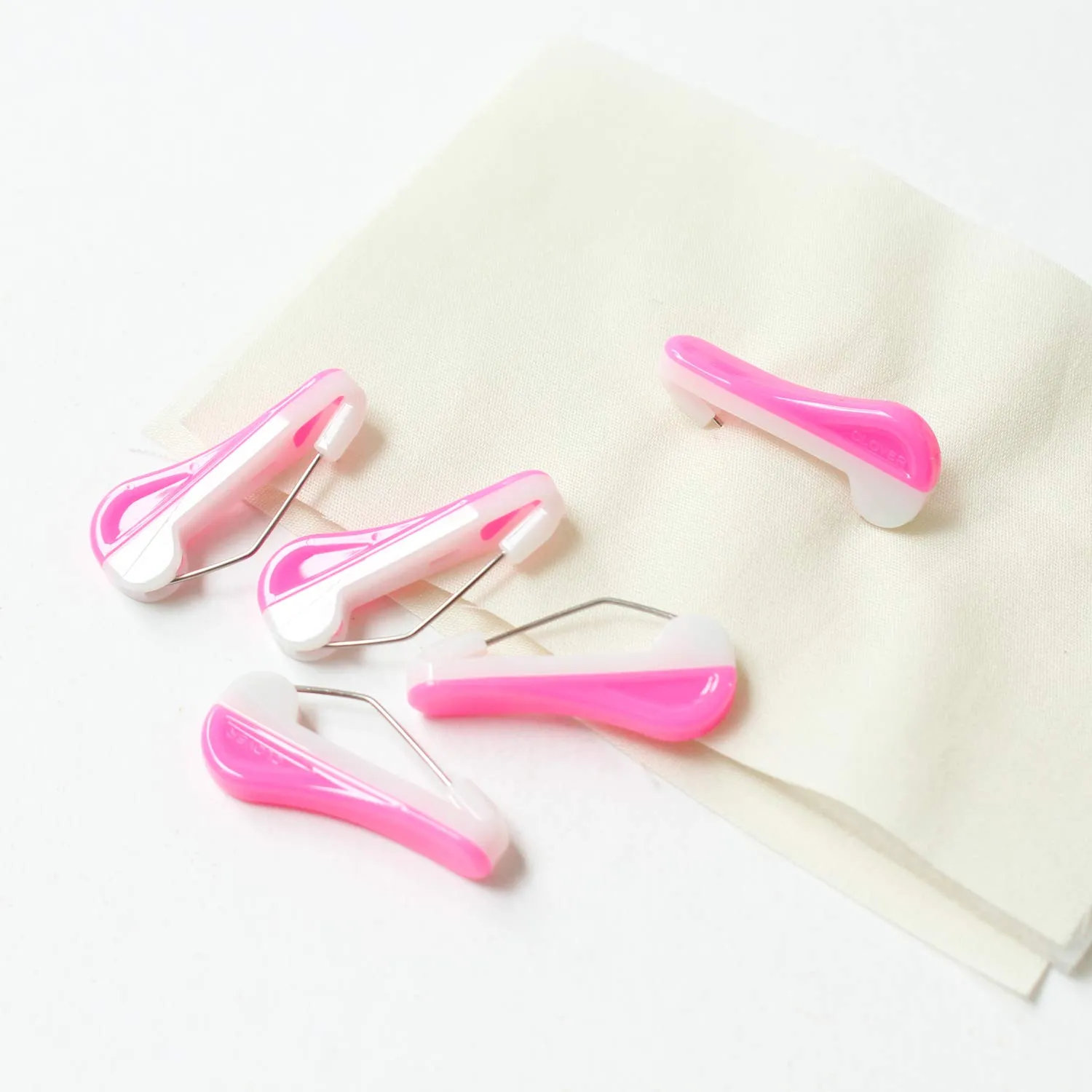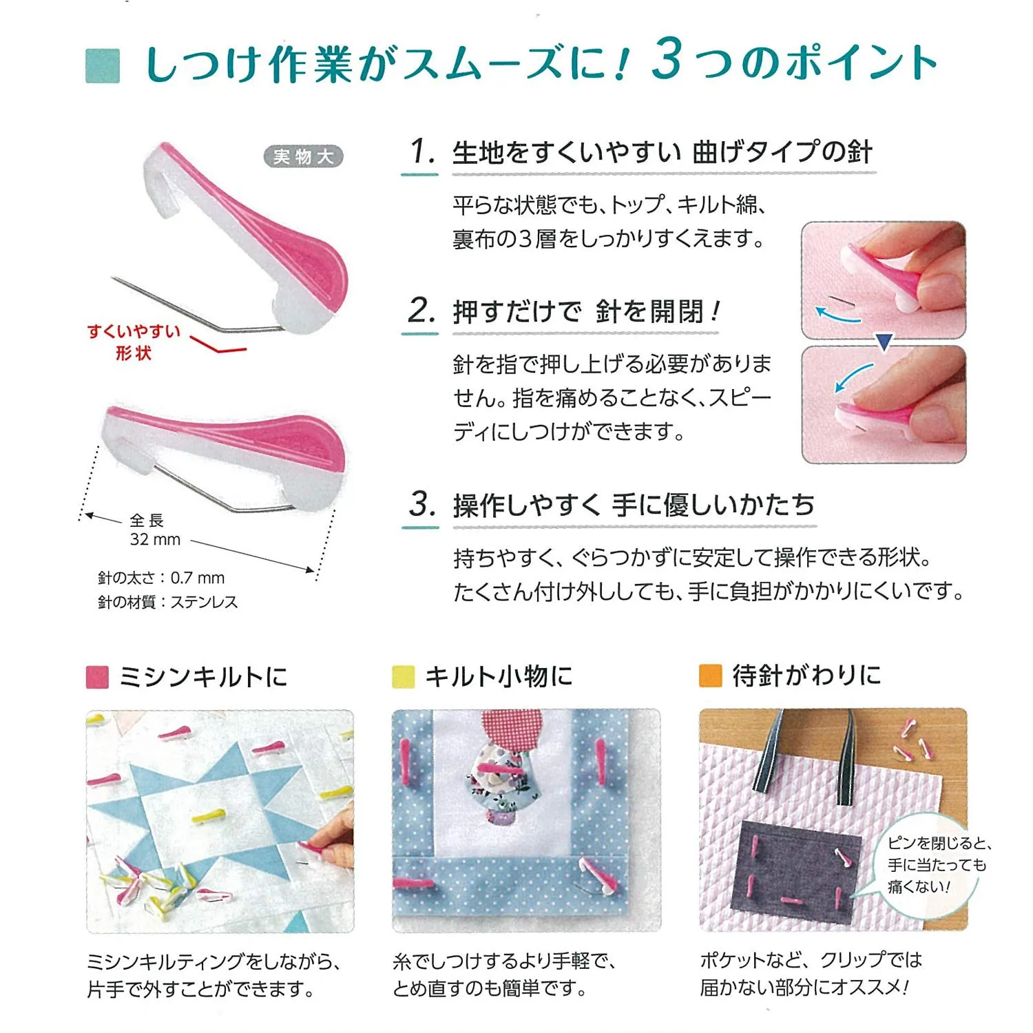 押すだけで簡単にとまるしつけピン。しつけ作業がスムーズにできます!ミシンキルティングをしながら片手で簡単に取り外せます。キルト小物を制作中、糸でしつけるより手軽でとめなおすのも簡単です。待ち針代わりにポケットなど、クリップでは届かないところにおすすめです。ピンを閉じると手に当たっても痛くない!生地をすくいやすい曲げタイプの針で、押すだけで針を開閉!操作しやすい手にやさしい形のデザインになっています。