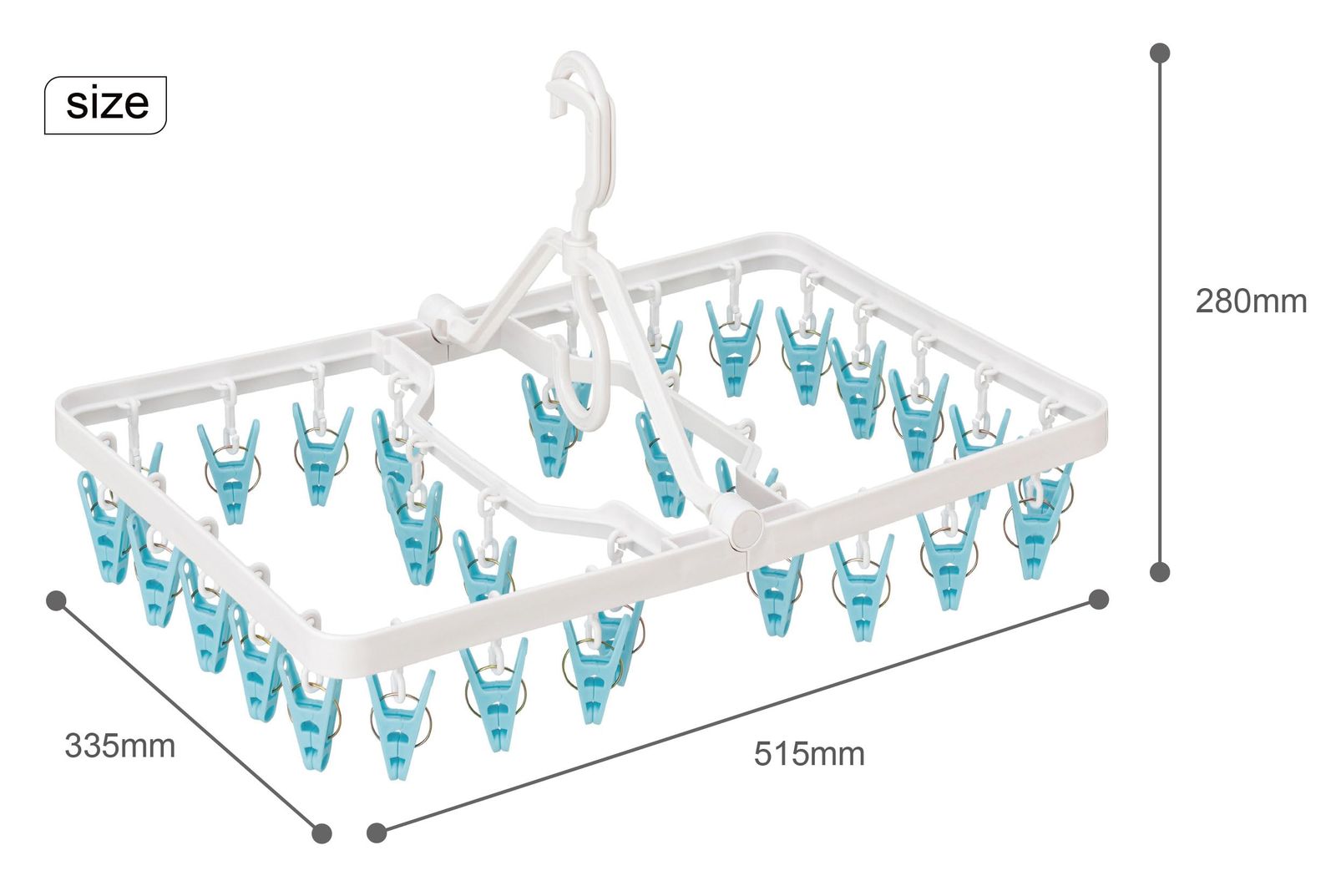 【ご注意】 ・本来の用途以外には使用しないでください。 ・使用前に製品各部を点検し、異常が認められる場合は使用しないでください。 ・洗濯ばさみ先端の平らな面は軽い洗濯物用です。重い洗濯物は奥の凸凹面ではさんでください。 ・洗濯物を直接引っぱってはずさないでください。本品や洗濯物が破損することがあります。 ・手や指をはさまないようにご注意ください。 ・強風時は室内に取り入れてください。 ・洗濯物の材質等によっては、はさみ跡が残る場合があります。 ・ランジェリー、ストッキング等を干す場合、奥の凸凹面で引っ掛けることがありますのでご注意ください。 ・洗濯物はバランスよく干してください。荷重が片寄ると破損・変形することがあります。 ・フックで掛けられる竿は、直径3cm以内の竿です。 ・使用後は室内で保管してください。長期間直射日光にさらすと劣化が進み破損しやすくなります。 ・洗濯ばさみが弱くなったと感じられた場合は、新しい洗濯ばさみとお取り替えください。 ・火のそばや高温になる場所には置かないでください。 ・廃棄時は各自治体の定める方法に従って処理してください。 商品サイズ:縦51.5cm×横33.5cm×高さ28cm 材質:(本体)ポリプロピレン、(バネ)鋼 カラー:ホワイト 生産国:中国 最後までご確認頂き誠にありがとうございました。 上記をご確認頂き、ご購入いただけましたら幸いです。 何かご不明な点がございましたらお気軽にメッセージからお問い合わせ下さい。