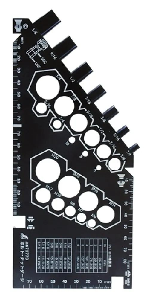●様々な形状のネジの長さを測れます。 サイズ:236×100×6mm 用途:ナットサイズ(ユニファイ用)、皿ネジ・丸皿ネジの長さ、六角ボルト・ナベ小ネジ長さ、インチネジ直径、ミリネジ直径などの測定。 仕様:インチ・mm換算表付 最後までご確認頂き誠にありがとうございました。 上記をご確認頂き、ご購入いただけましたら幸いです。 何かご不明な点がございましたらお気軽にメッセージからお問い合わせ下さい。