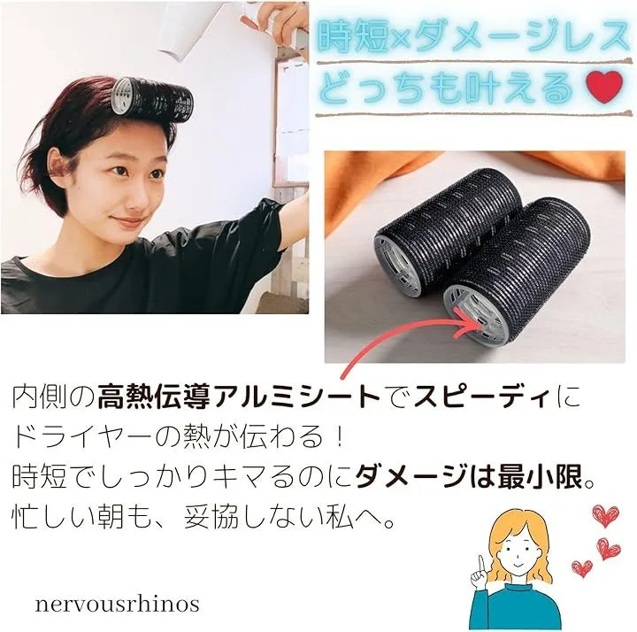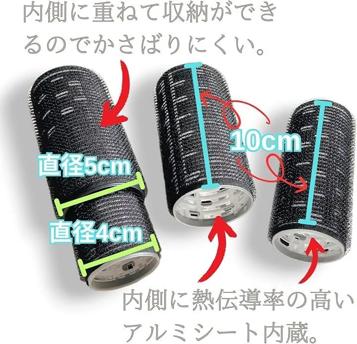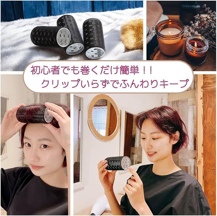 ゆるふわも、立ち上げ前髪もこれ1セットでOK。 ・太巻きスタイルにぴったりの特大ビッグカーラー(直径5cm長さ10cm)x2・前髪やサイドに便利なミドルサイズ(直径4cm長さ10cm)x2個 すべて使いやすいマットブラックで、大人っぽ可愛い仕上がりに.