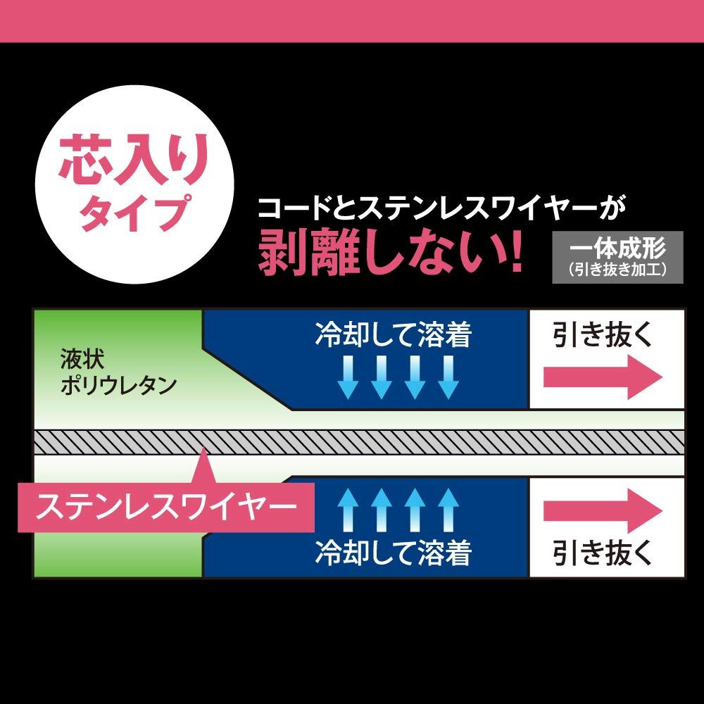 コードとステンレスワイヤーが一体成型(引き抜き加工)で剥離しない。