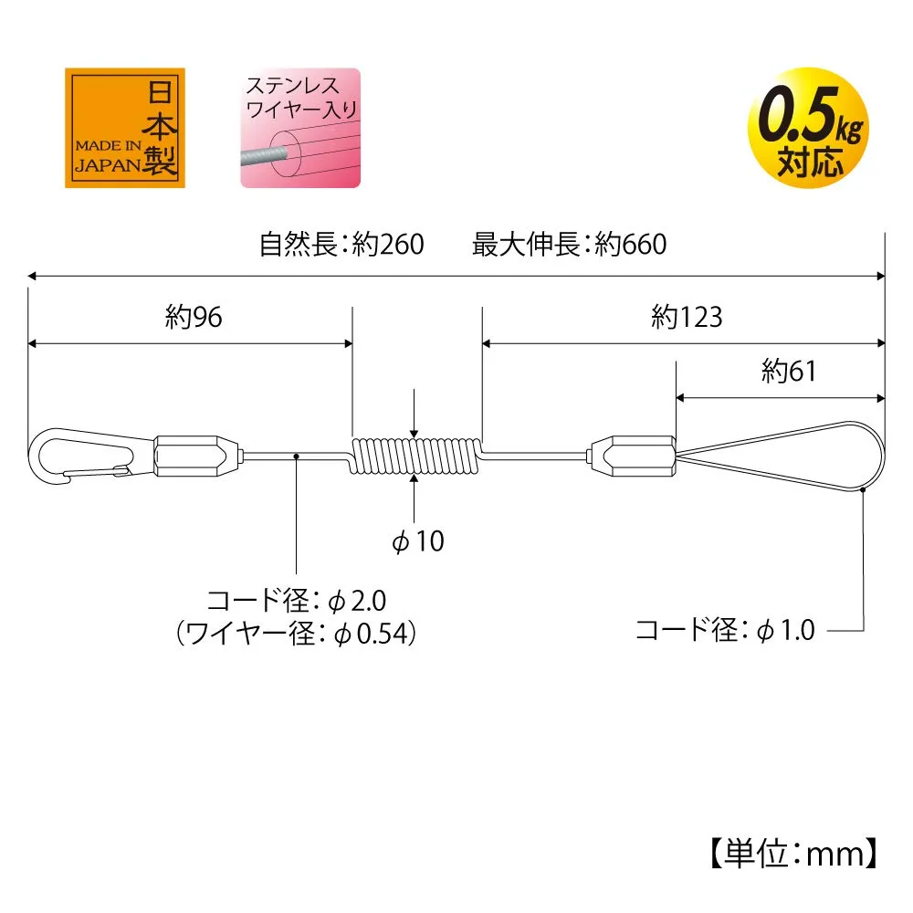 材質:より戻し/ポリカーボネード樹脂、ワイヤー/ステンレス、コード/ポリウレタン