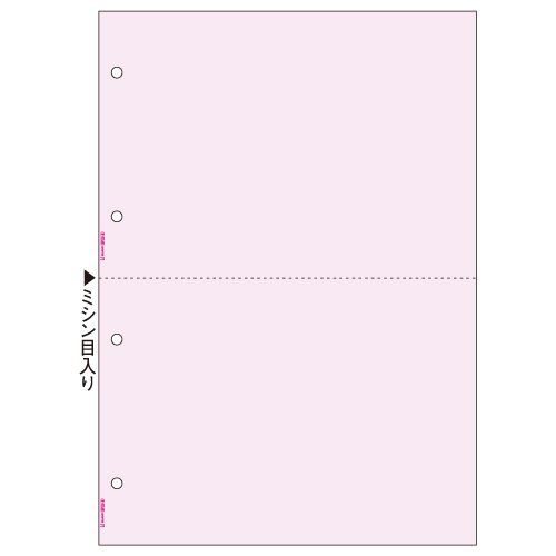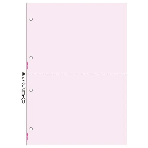 A4ピンク2面。ファイル穴:2穴(80mm)。ミシン目切り離し後のサイズ:ヨコ210xタテ148.5mm。紙厚:0.08mm。クリアカットミシンでキレイに切り離せます。納品書などの帳票の印刷に。ブルー・クリームの色違いもあり。帳票の用途に合わせて色分けが可能です。