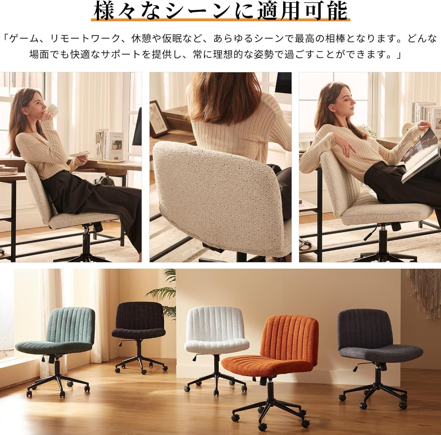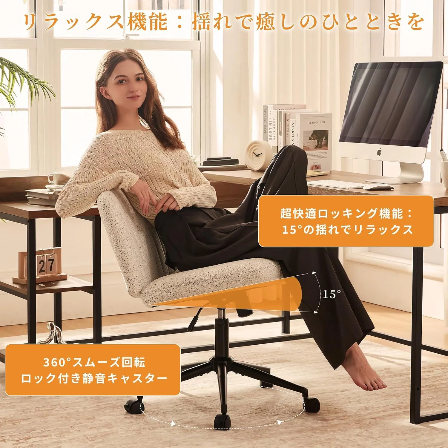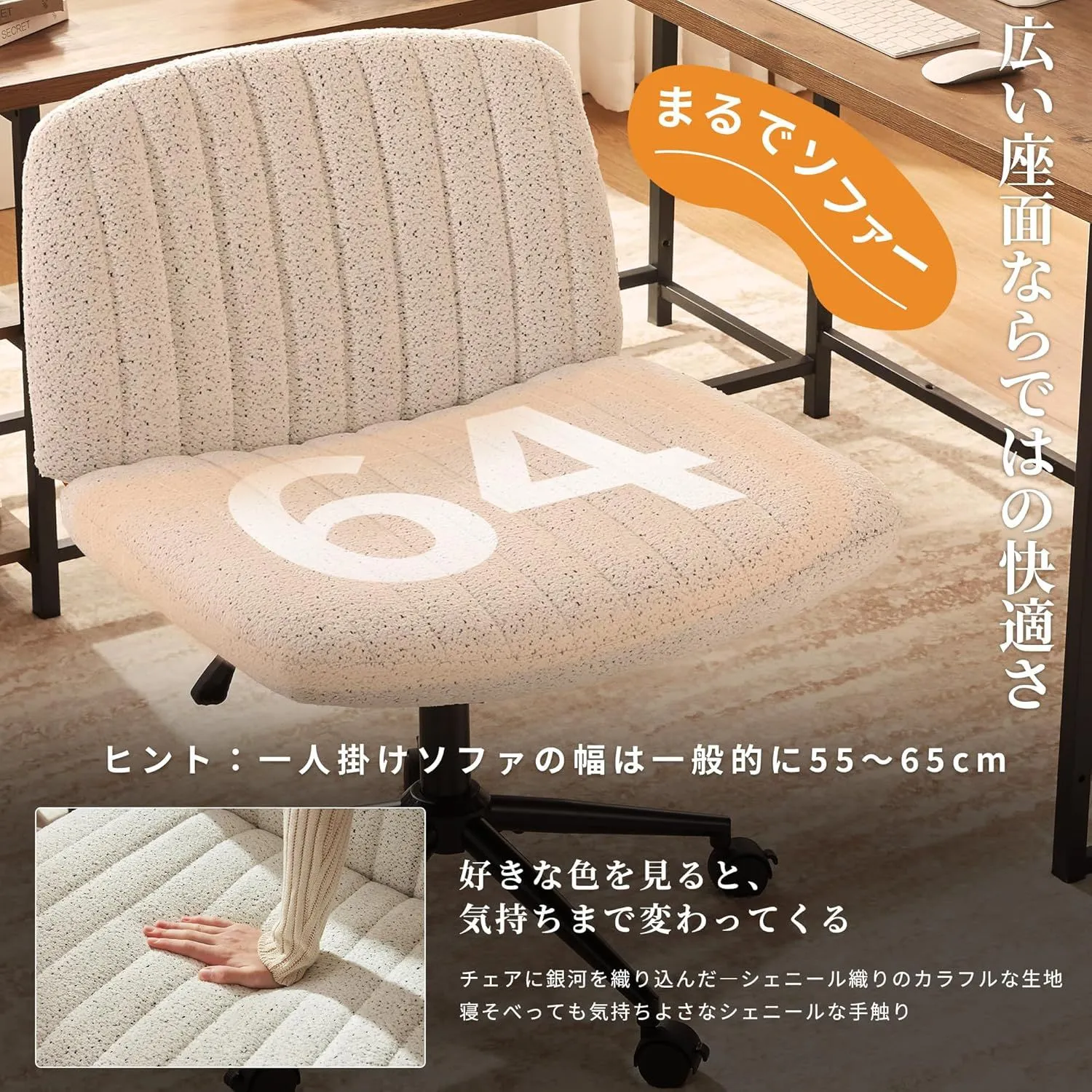 04234LS-HC01スノーホワイト デスクチェア あぐらチェア シェニール織 ロッキングチェア 座面が広い椅子 ロック付きキャスター おしゃれ 360°回転 胡座椅子 オフィスチェア パソコンチェア 10cm高さ調節可能テレワーク 肘掛なし