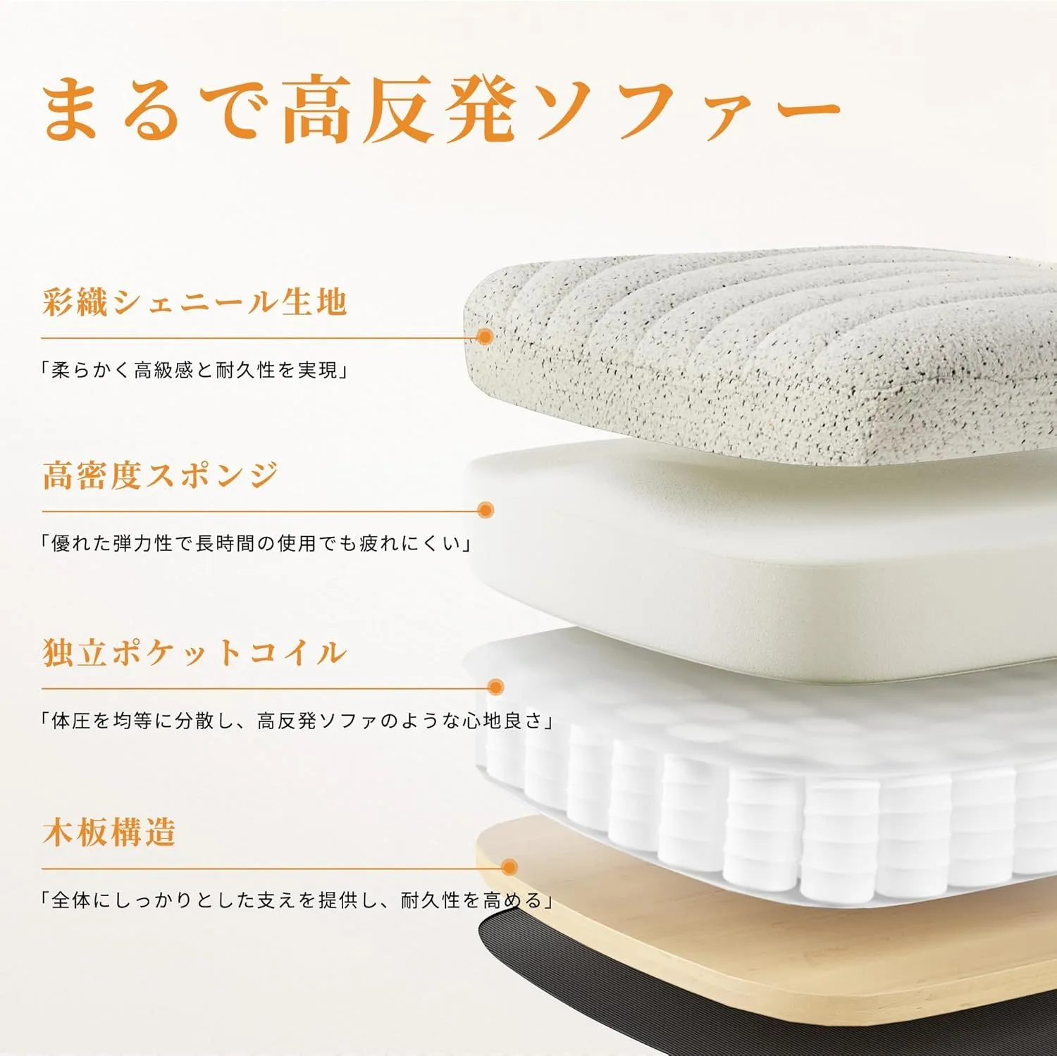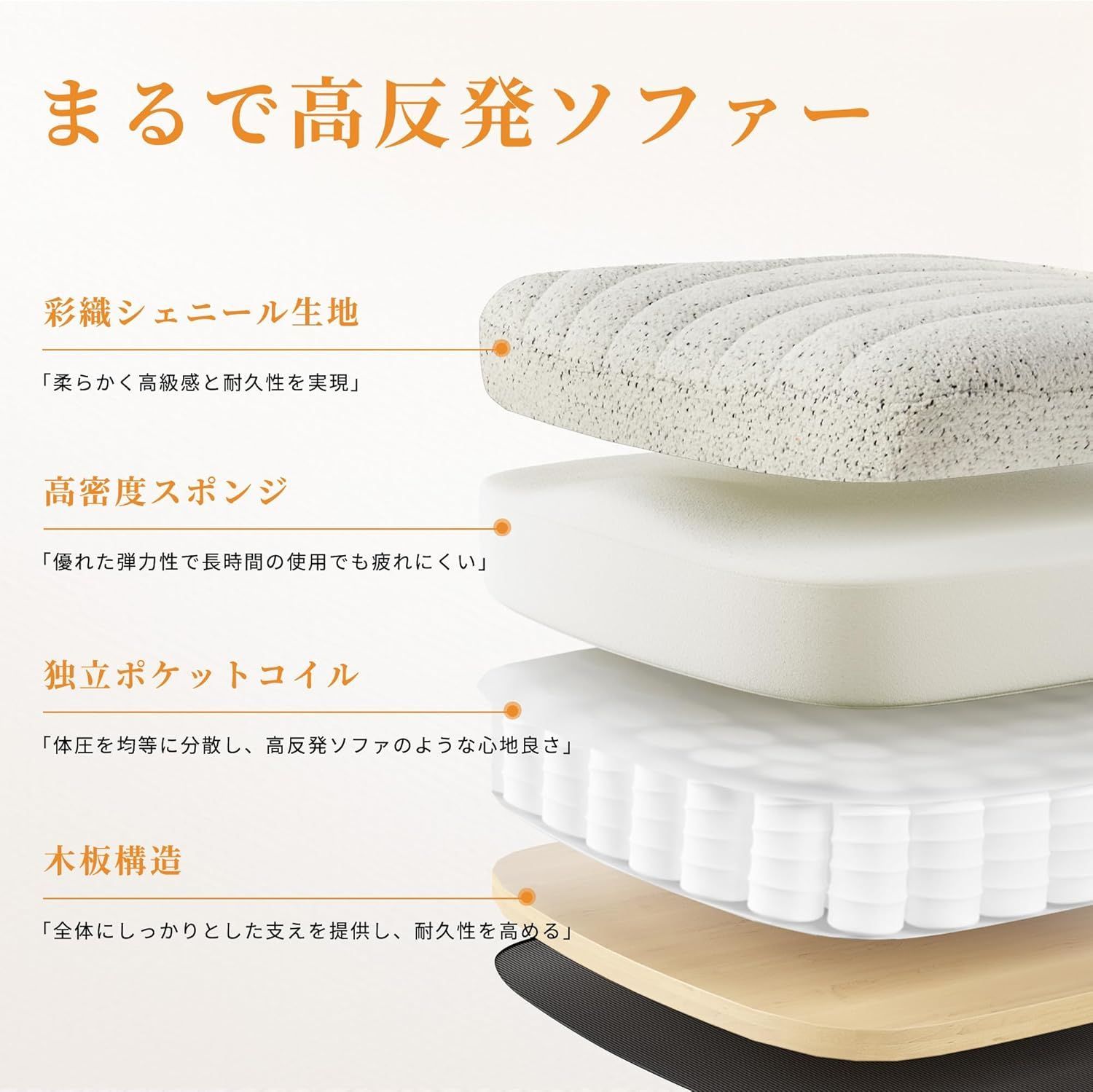 【ソファのような贅沢な座り心地&四層構造】極上の快適さと耐久性を両立させるため、精巧な多層構造を採用しています。シェニール生地を使用した座面は、柔らかく肌触りが良いだけでなく、長年使ってもその高級感を失いません。さらに、内蔵された高密度スポンジが、長時間座ってもお尻をしっかりと支え、へたりにくく疲れにくいデザイン。独立ポケットコイルが体圧を均等に分散し、腰や背中を優しくサポートすることで、まるで高反発ソファに座っているような心地良さを感じられます。加えて、頑丈な木板構造が全体の安定性を確保し、耐久性も申し分ありません。