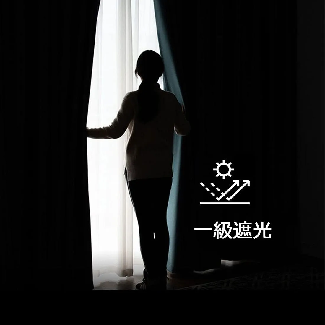<1級遮光 99%以上> 三層1級遮光素材(遮光度99%以上)で、日光や街灯の光をしっかり遮断します。室外陽光阻まれて、たとえ猛暑が続くても、薄暗く涼しい雰囲気を持っています。