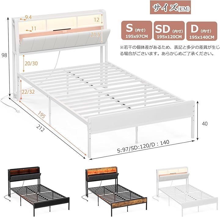 「商品仕様」*商品サイズ(cm):幅140x奥行212x高さ98cm *対応マットレスサイズ:ダブルサイズ(幅140x長さ195cm)*商品重量:約32kg *梱包サイズ:148x43.5x14.5CM *梱包重量:35kg *材質:本体/スチール(粉体塗装)棚板/MDF *耐荷重:本体/約350kg ヘッド部棚/約20kg *カラー:ブラック/ホワイト/ビンテージ 組立品/完成品:組立品(2人で組立て時間約45分)。