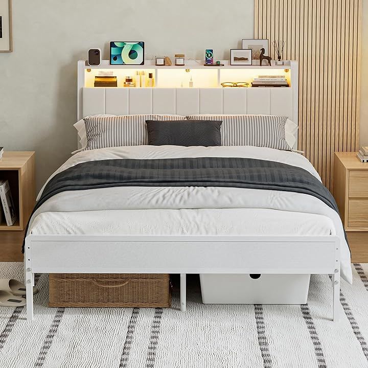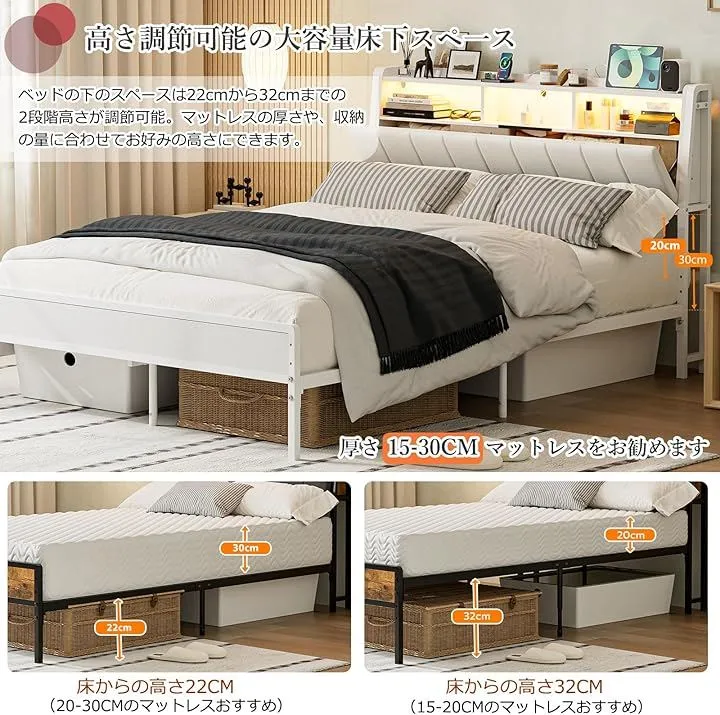 IKIFLY ベッドフレーム ファブリックベッド収納宮棚付き パイプベッド ダブルベッド スチールベッド 2段階高さ調整 布張り 静音 通気性 頑丈 カビ防止 安定性 耐久性 (ホワイト, ダブル)