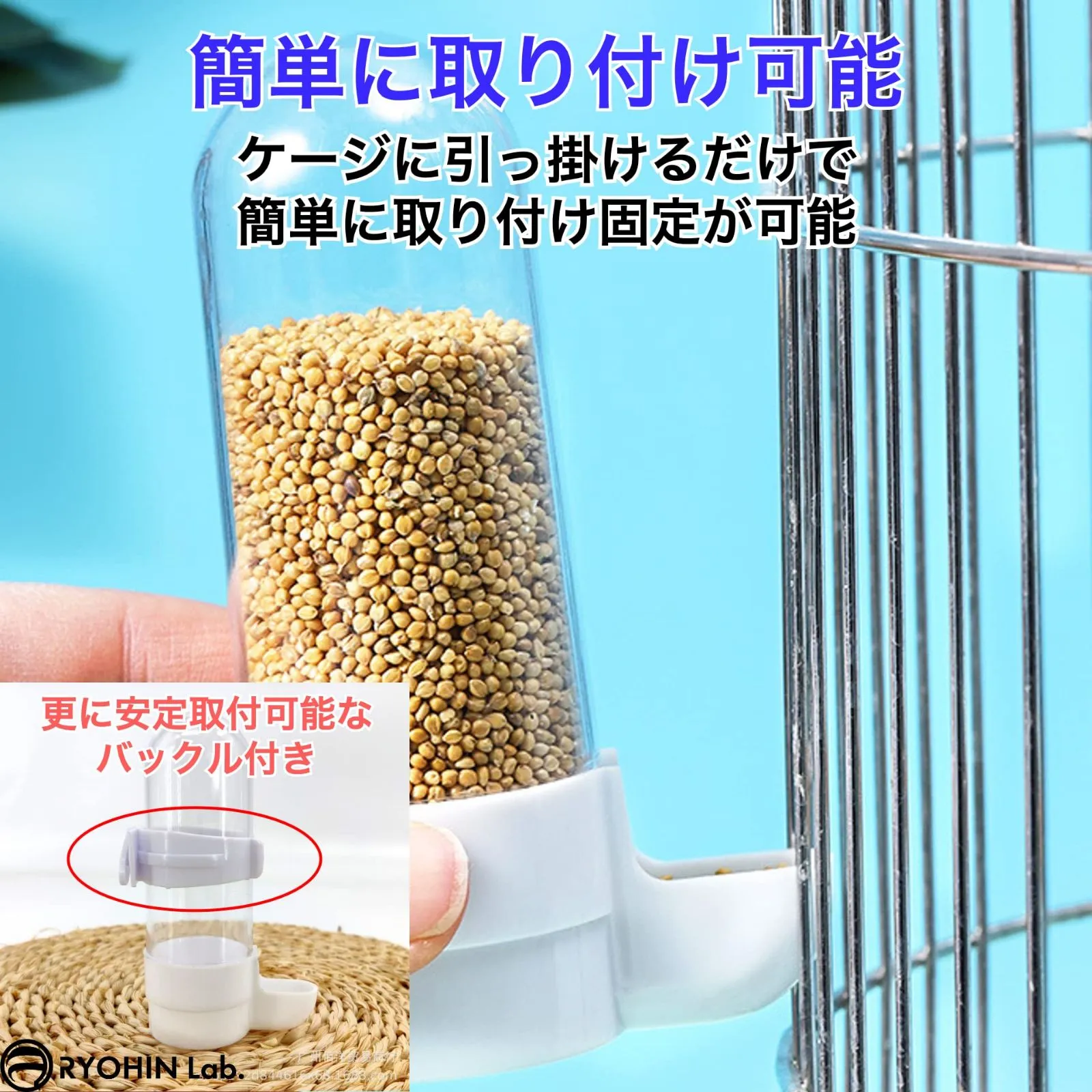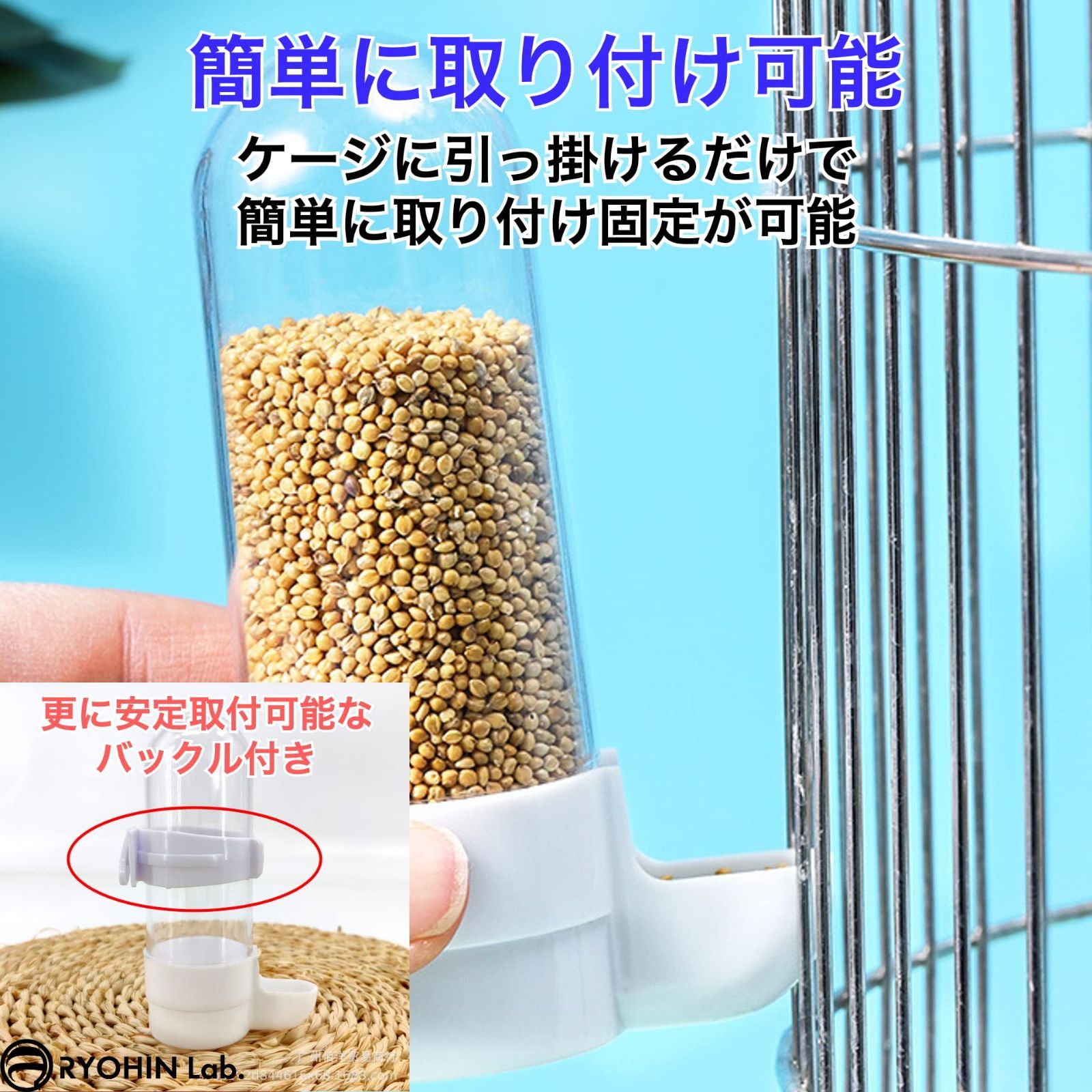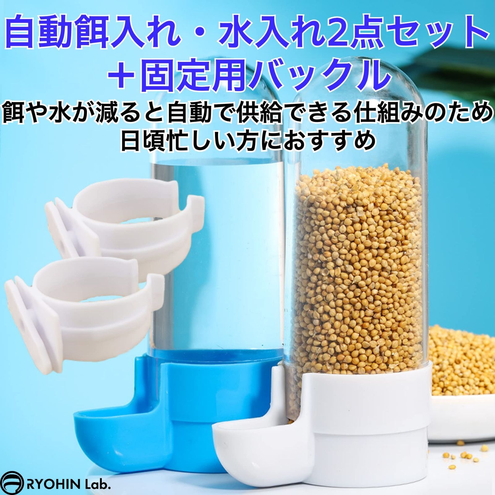 【在庫セール】RYOHIN Lab.(良品ラボ) 自動餌入れ 鳥 水入れ 給餌器 給水器 ペット用 小動物 餌やり 水やり プラスチック 青 白 2個セット (本体+バックル)