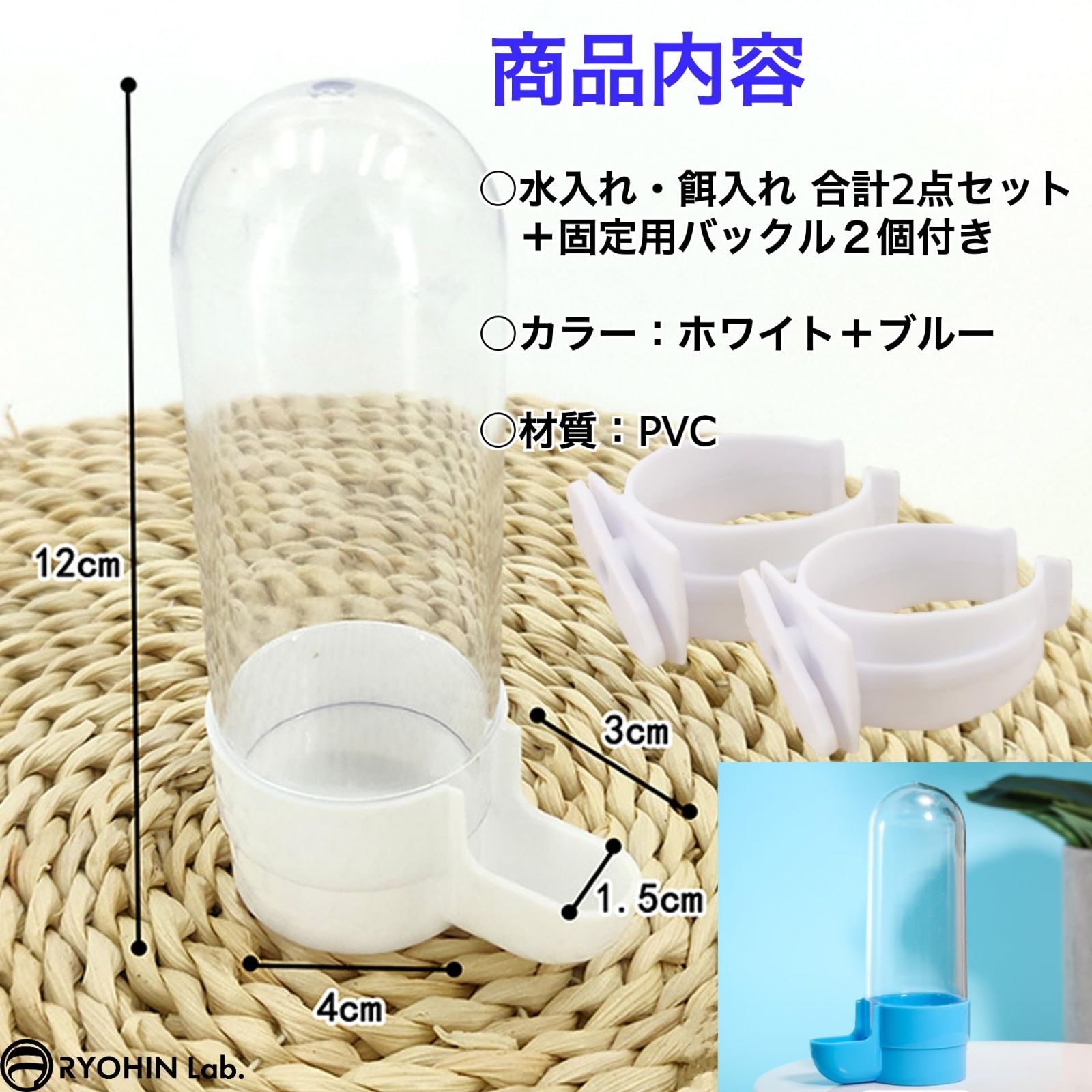 【商品仕様】セット内容:水入れ・餌入れ 合計2点セット+固定用バックル2個付き、サイズ(約):本体部12×4cm・給餌部3×1.5cm、カラー:ホワイト+ブルー、材質:PVC ※モニターの環境等により、色の見え方に若干差が生じる場合がございます。 材質 ポリ塩化ビニル ターゲット種 トリ ブランド RYOHIN Lab. 特徴 自動給餌給水 色 白 最後までご確認頂き誠にありがとうございました。 上記をご確認頂き、ご購入いただけましたら幸いです。 何かご不明な点がございましたらお気軽にメッセージからお問い合わせ下さい。