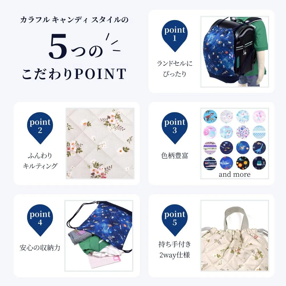 ●商品仕様について 商品は写真と異なる場合や同等品へ仕様変更する場合がございます。予めご了承ください。 また、お揃い生地商品が完売の際はご了承ください。 キッズ&ベビー用品のCOLORFUL CANDY STYLE (カラフル キャンディ スタイル) は入園・入学グッズからキッズ向け各種ライフスタイルアイテムまで豊富な色柄をラインアップ。 大切なお子様が「毎日使うもの」を選択するなら、マーケットでひとくくりに「幼稚園児用」、「小学校低学年用」と分類されたものや大量生産のキャラクターだけを選択肢にすることでよいのだろうか、という疑問から当ブランドは始まりました。 お子様一人ひとりの興味や個性、ご家庭の教育方針やご両親の好み・センスは千差万別です。 また、子供の成長の度合いがそれぞれに異なることはママやパパならどなたでも実感されていることでしょう。 毎日こどもが手にするものだからこそ、一人ひとりの個性や発達段階に沿ったものを選ぶべき、と考えます。 (より) 最後までご確認頂き誠にありがとうございました。 上記をご確認頂き、ご購入いただけましたら幸いです。 何かご不明な点がございましたらお気軽にメッセージからお問い合わせ下さい。