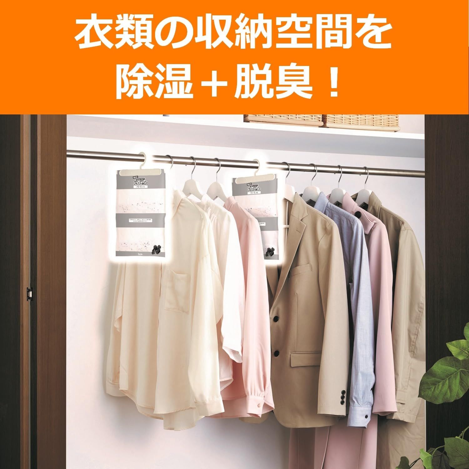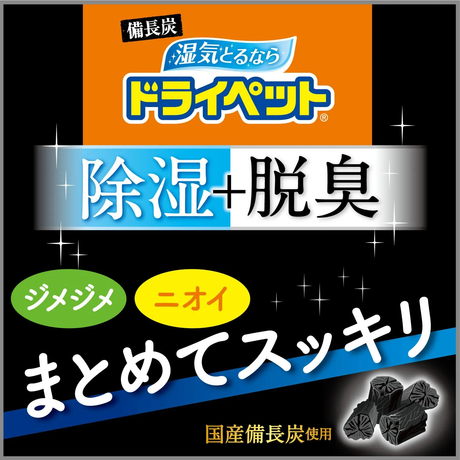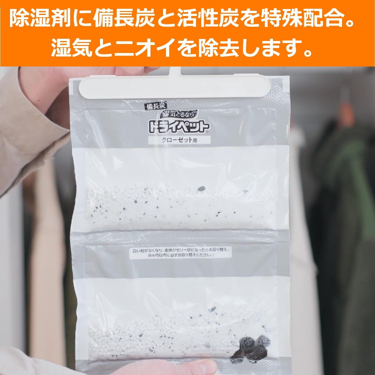 【除湿+脱臭】除湿剤に備長炭と活性炭を特殊配合しているので、湿気をとりながら気になるニオイを脱臭します。