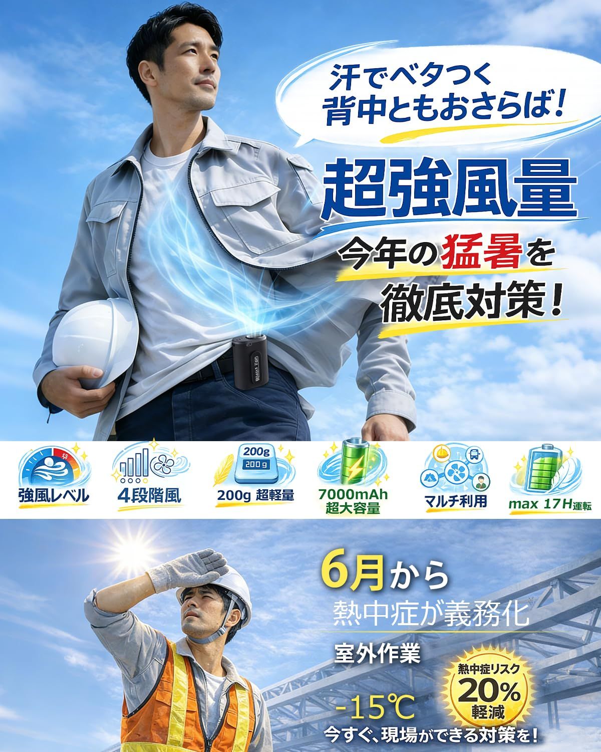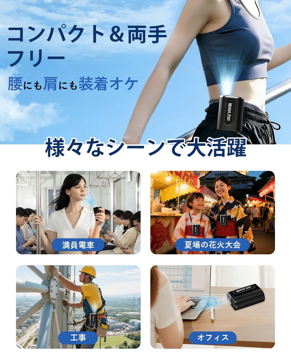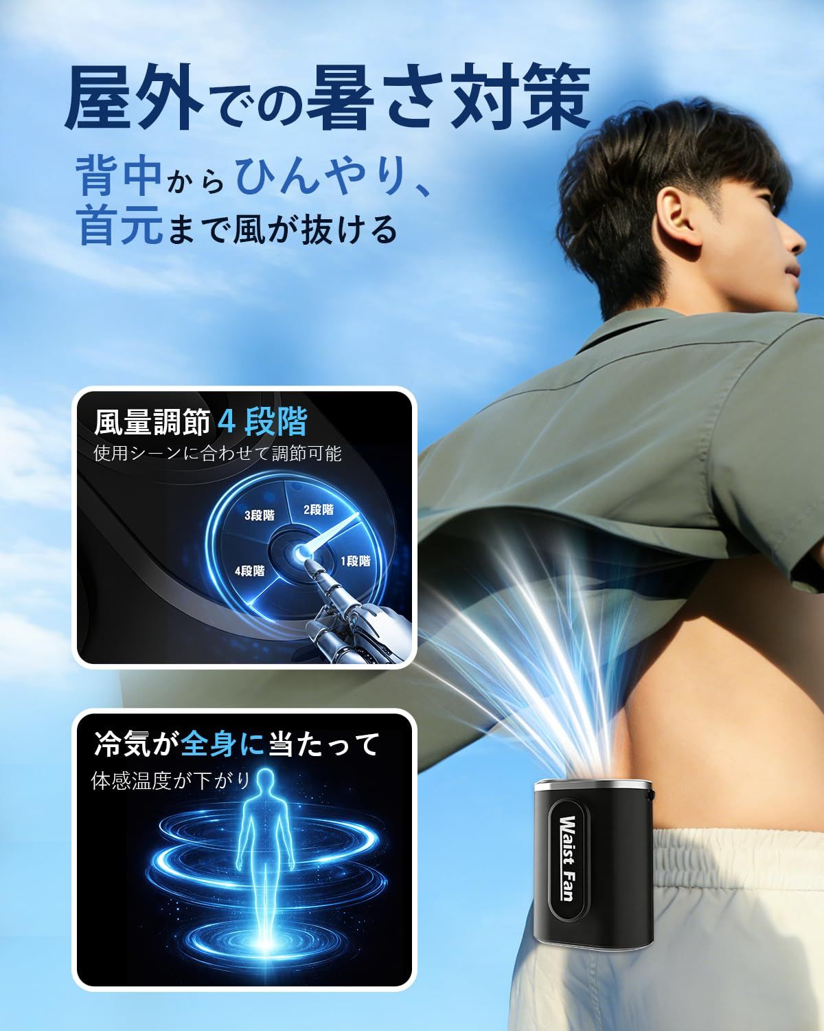 【強力送風、背中からひんやり、首元まで風が抜ける】コンパクトながらパワフル送風を実現した 強力 腰掛けファン 。腰に装着することで風が上向きに流れ、服の中へ空気を送り込み、汗でベタつく背中ともおさらば。エアロダイナ設計で。ムレを一気に解消。蒸れやすい夏場でも快適に過ごせるため、満員電車、工事現場・農作業・倉庫作業・配達業務などにも最適。大風量ウエストファン として、炎天下の暑さ対策や 熱中症対策 にも頼れる 腰掛け扇風機 です。