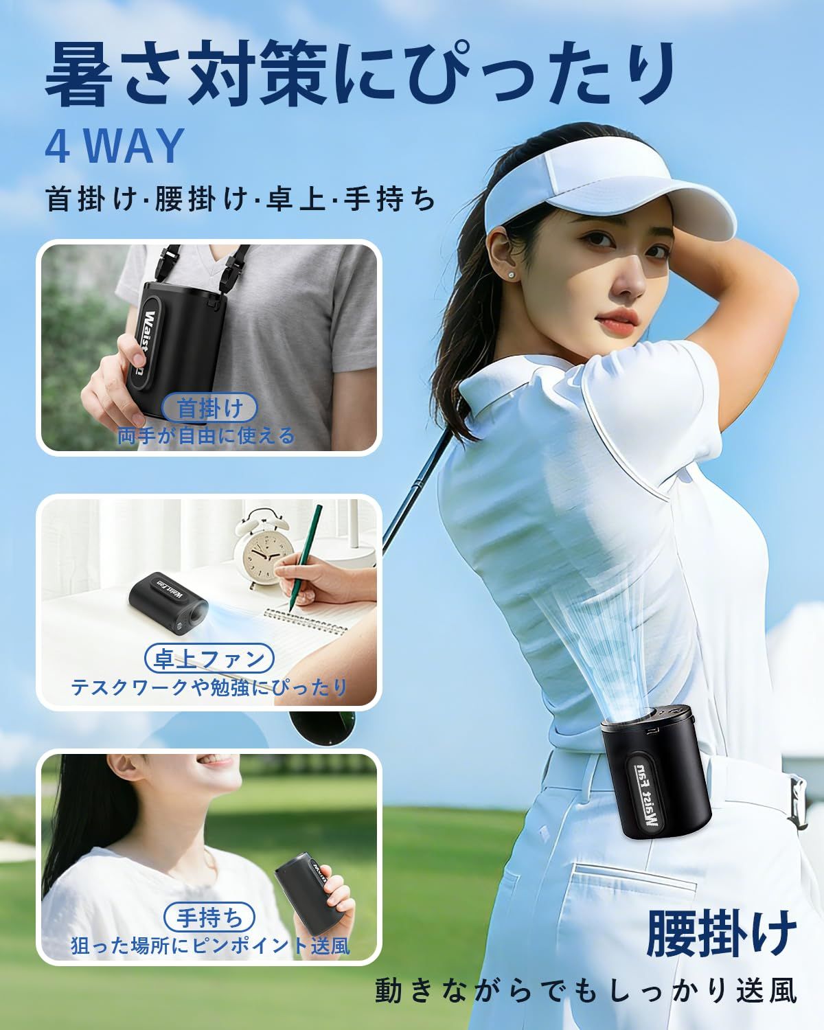 【1台4役で両手フリー、仕事と通勤に最適なパートナー】本扇風機は、作業中でも快適に涼める 小型で腰掛けファンです。ベルトに固定して腰に装着できるため、荷物を持ちながらでも両手が自由になります。満員電車でも両手が自由に!スマホも吊革もしっかり掴める、ながら通勤の味方です。さらに 首掛け扇風機、ハンディ扇風機、卓上扇風機としても使える 1台4役の多機能モデルです。