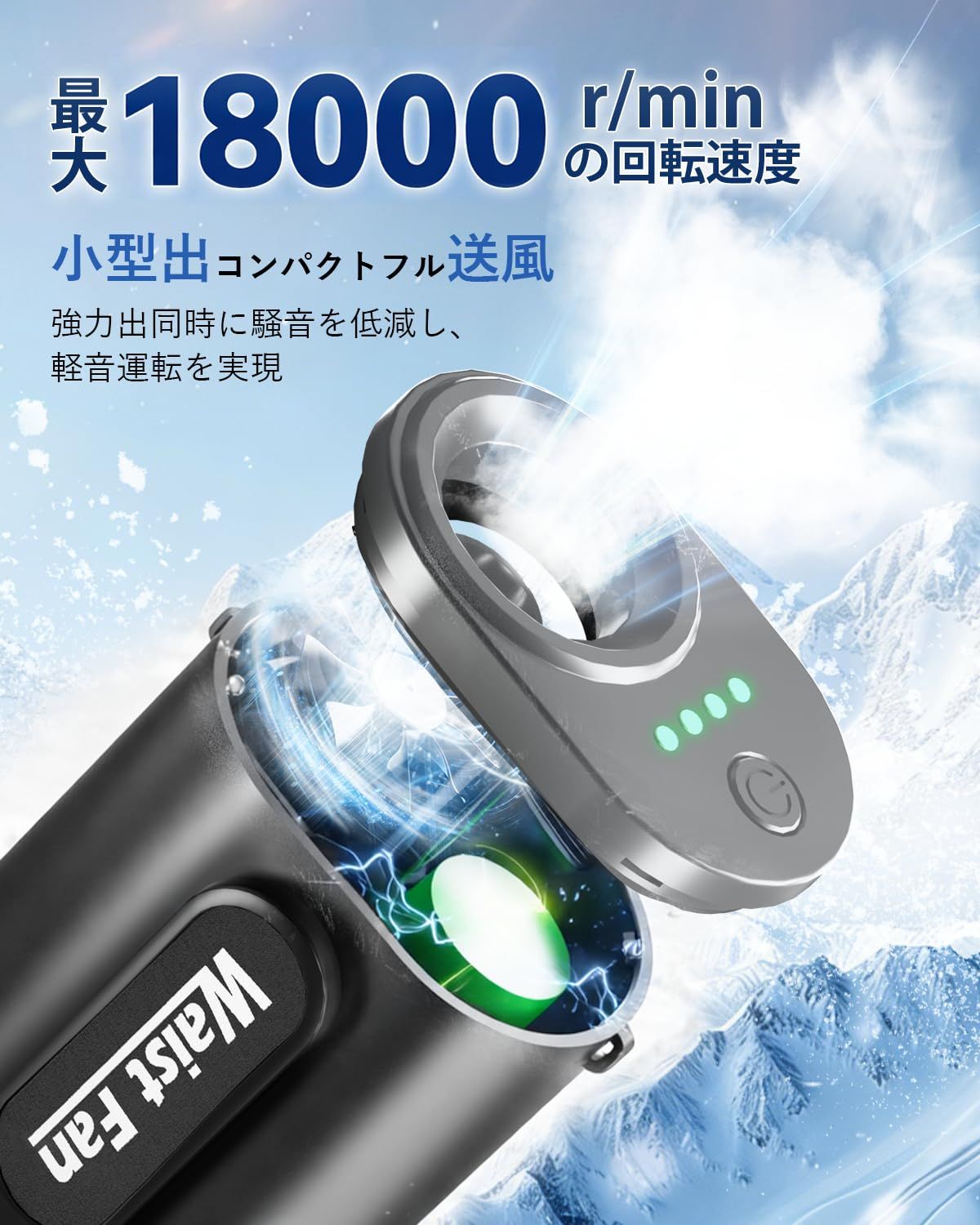 【4段階風量調節可能・静音】4段階の風量調整機能を搭載しており、ワンボタンで簡単に風量を選択できます。この腰掛け扇風機は心地良い微風から熱を一気に吹き飛ばす強風まで自由に調整でき、 静音設計で、オフィスなどの静かな環境で使用してもストレスなく快適で、より仕事や勉強に集中できます。18000rpmの高回転タービンブラシレスモーター、風力が強くて、超強風で数秒以内に冷却します。今年の猛厚を徹底対策です。