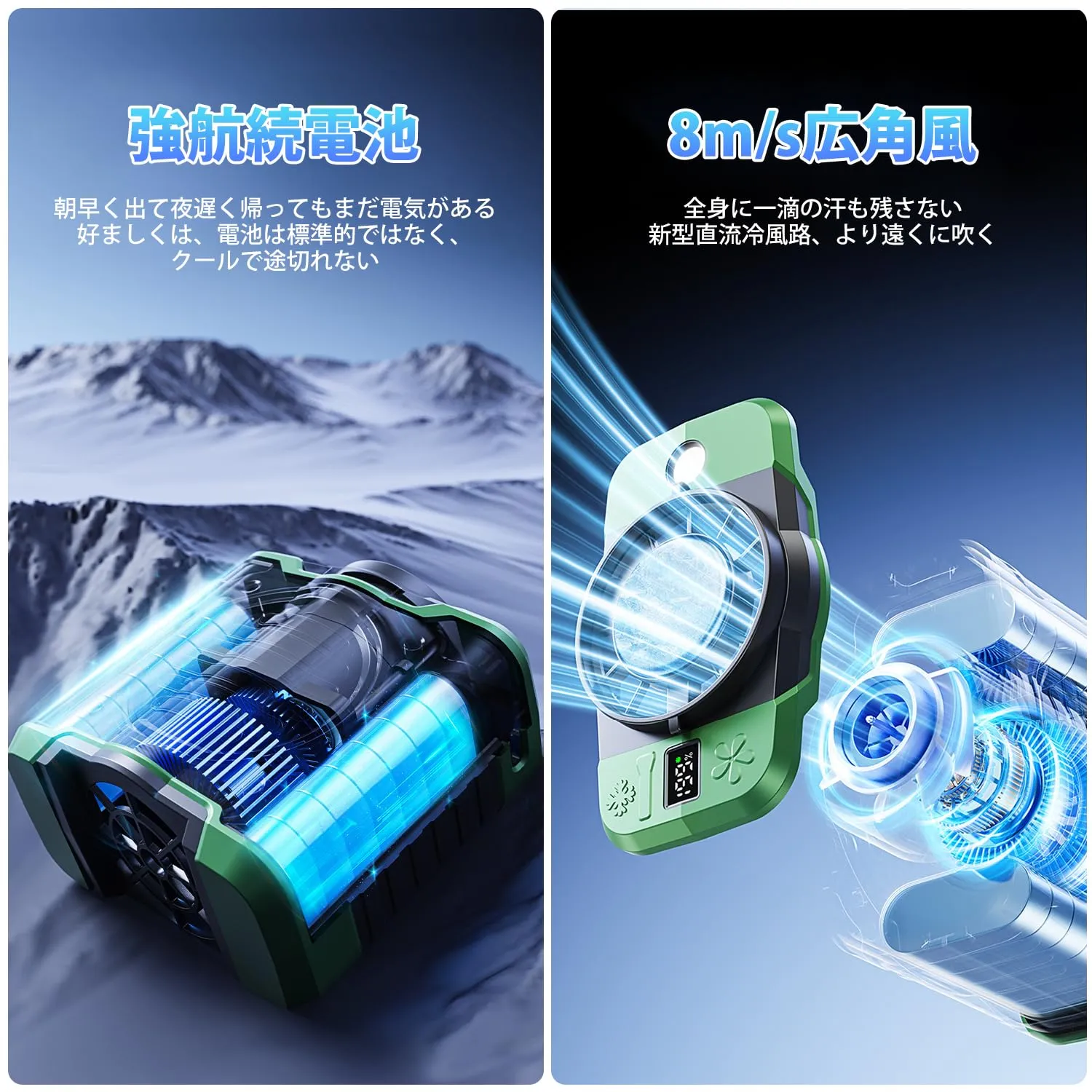 強力冷却機能:この腰掛けファンは、3秒で急速冷却し、体感温度を16℃も下げる「携帯用氷」のような効果があります。高回転エンジンとターボ増圧で強力な冷風を全身に広げ、8m/sの広角風で汗一滴残さず快適にお過ごしいただけます。新型直流冷風システムにより、より遠くまで冷風をお届けいたします