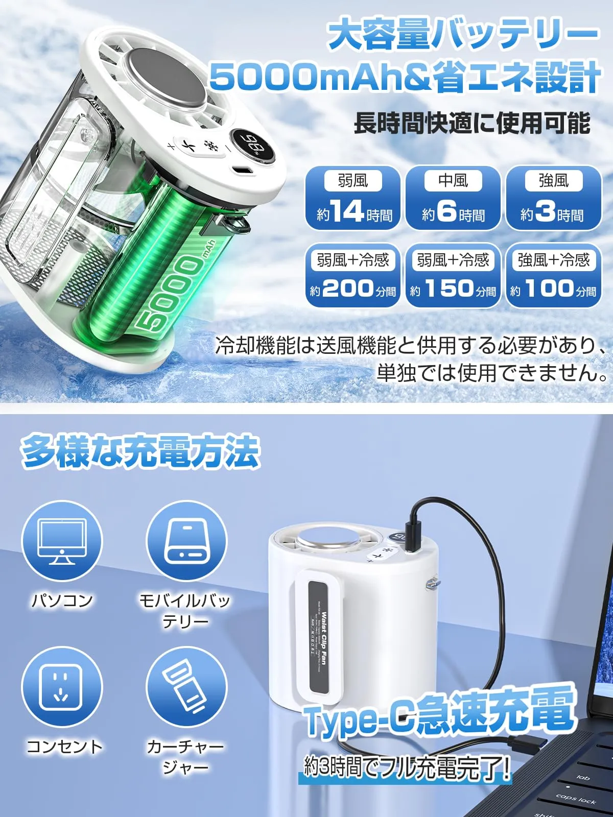 【長時間の電池寿命】5000mAhの大容量バッテリーを搭載し、最大14時間の連続使用が可能です。長時間の屋外活動やキャンプなどでも、電池切れを気にせずに使用できます。