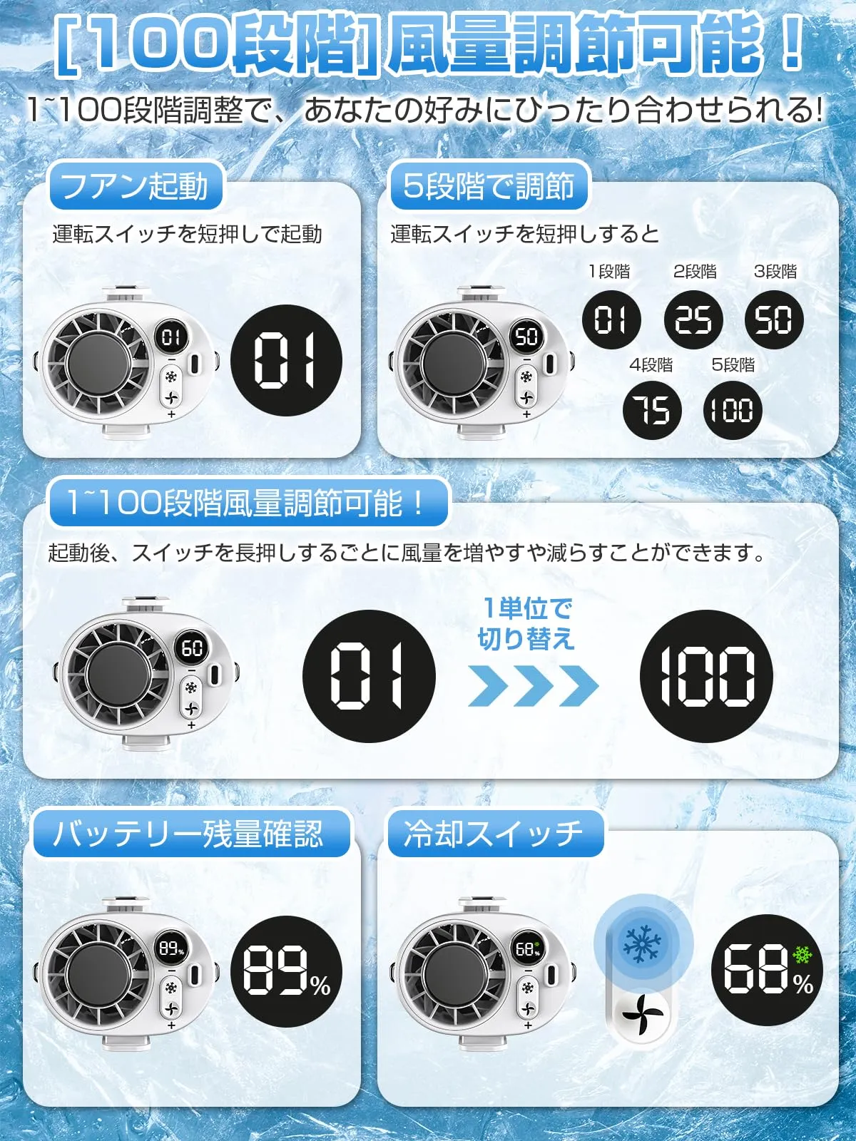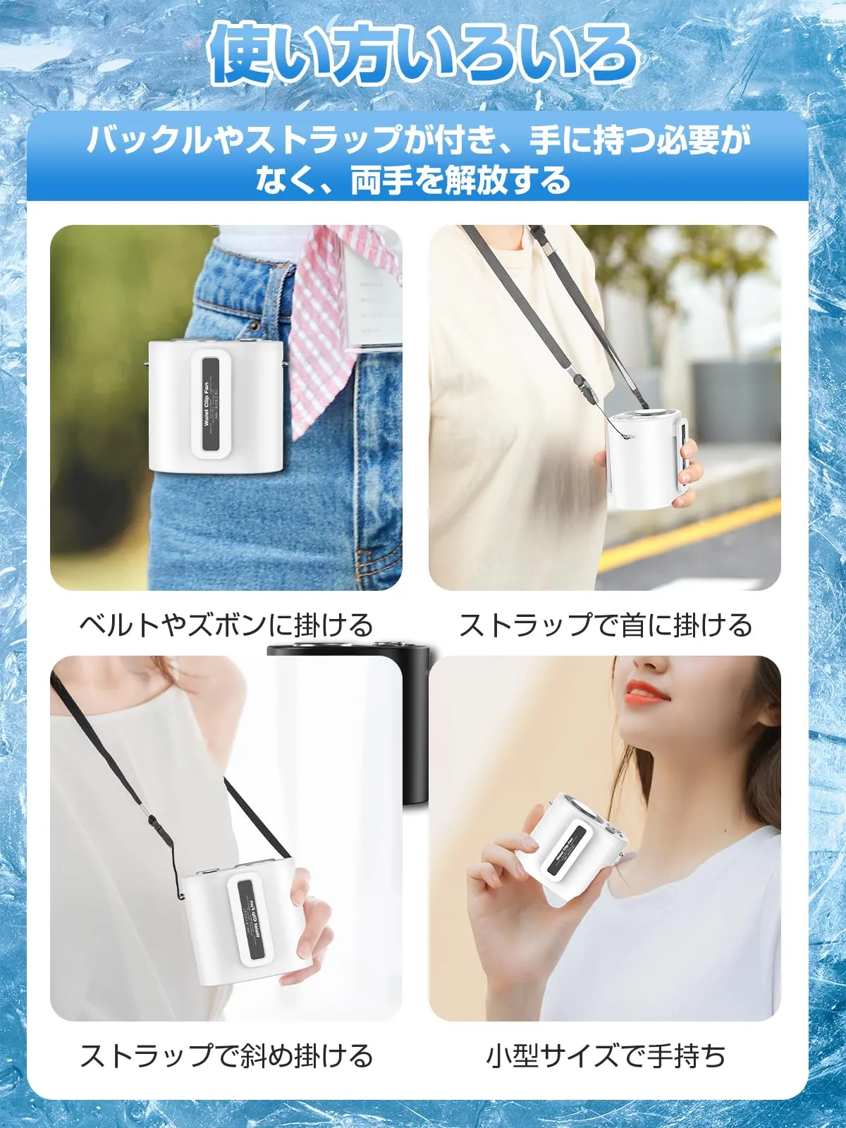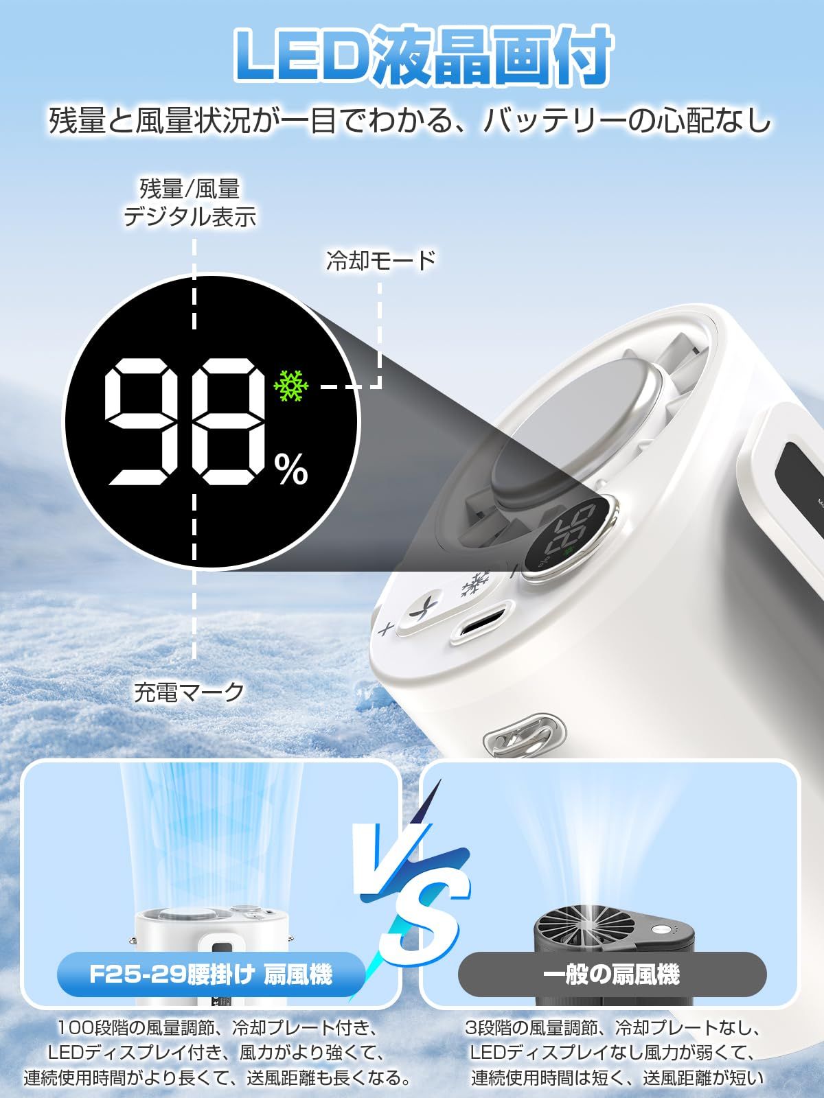 腰掛け 扇風機 ベルトファン ハンディファン 冷却プレート 携帯扇風機 充電式 アウトドア 5000mAh電池内蔵 100段階風量調節 LEDディスプレイ くびかけ 手持ち 4way腰掛けファン 屋外作業 農業 街頭販売 野外活動 花火大会 首掛け 両面クリップ付
