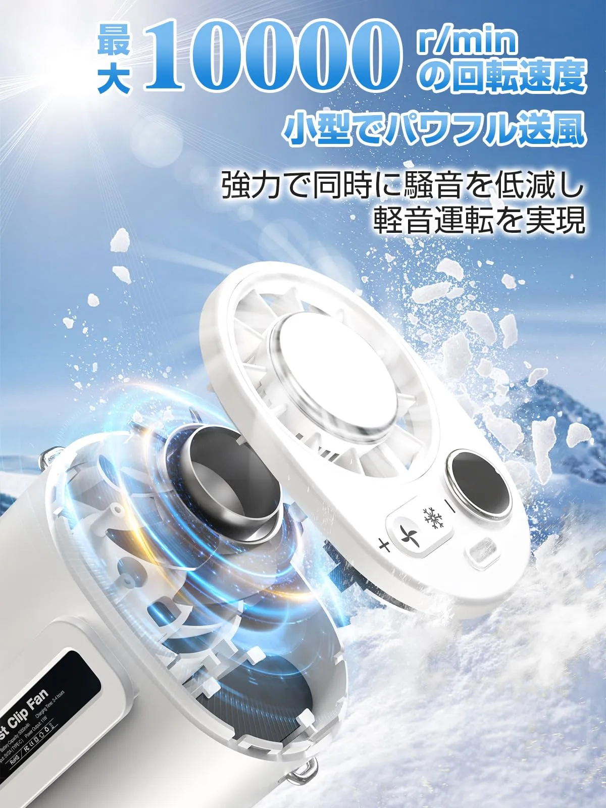 【コンパクトながら強力な風力】小型ながらも、1分間に1万回転の高速回転を実現し、強力な風を発生させます。強力な風で暑さを吹き飛ばし、快適な環境を維持します。