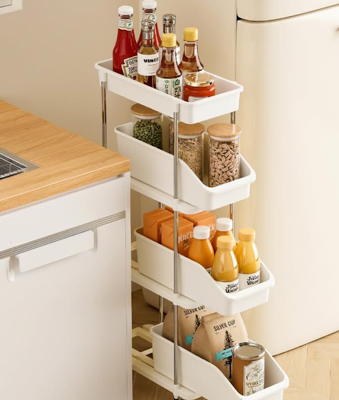 Ismerely キッチンワゴン 4段 引き出し 隙間収納 キャスター付き キッチンラック スリム 収納ワゴン 洗面所 収納棚 収納カート トイレ収納 調味料 小物 台所 冷蔵庫横 移動式 多機能 軽量 オープンシェルフ 組立簡単