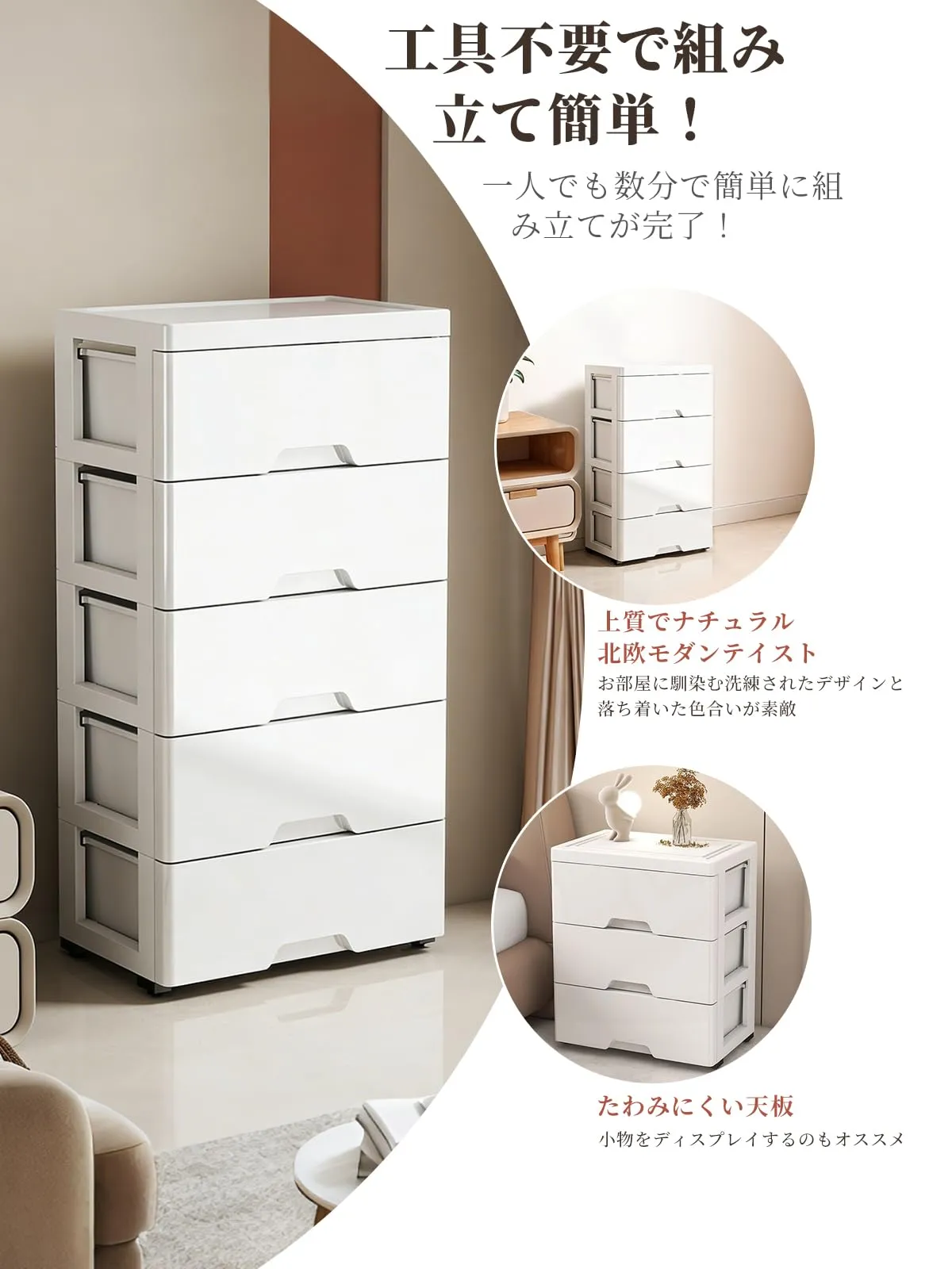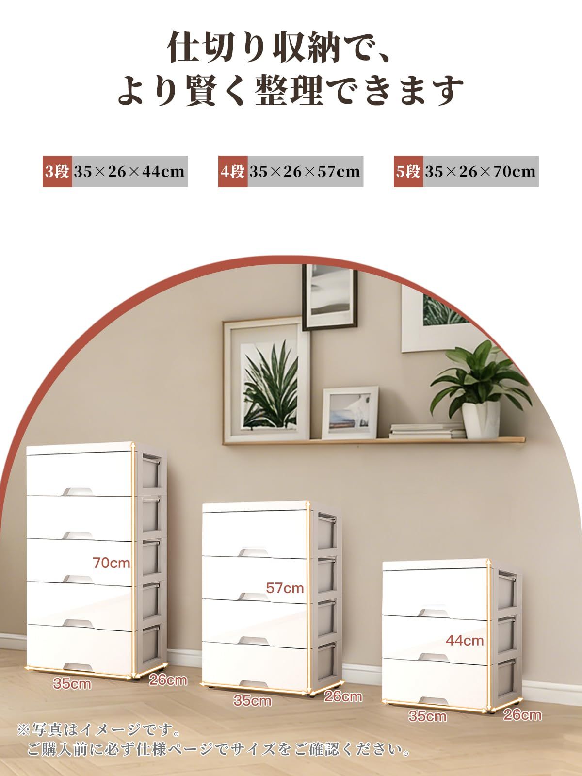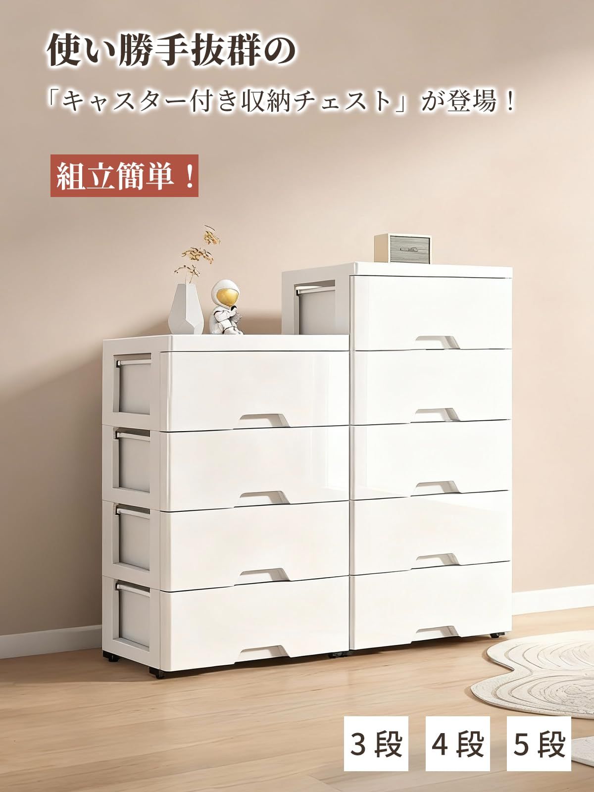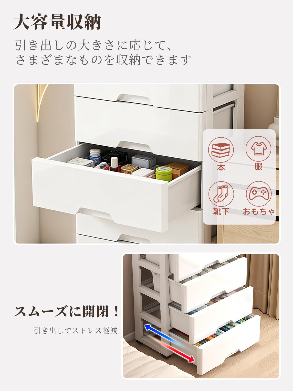 【抜群の収納力】充実収納で衣類整理がラクチン!複数の引き出しで構成されたチェストなので、衣類はもちろん、靴下、タオル、小物アクセサリーまできちんと整理収納できます。脱衣所の衣装ケースとして、リビングの収納ボックスとしても活用でき、一人暮らしからご家族用まで幅広く対応し、日常の整理整?に大きく貢献します。