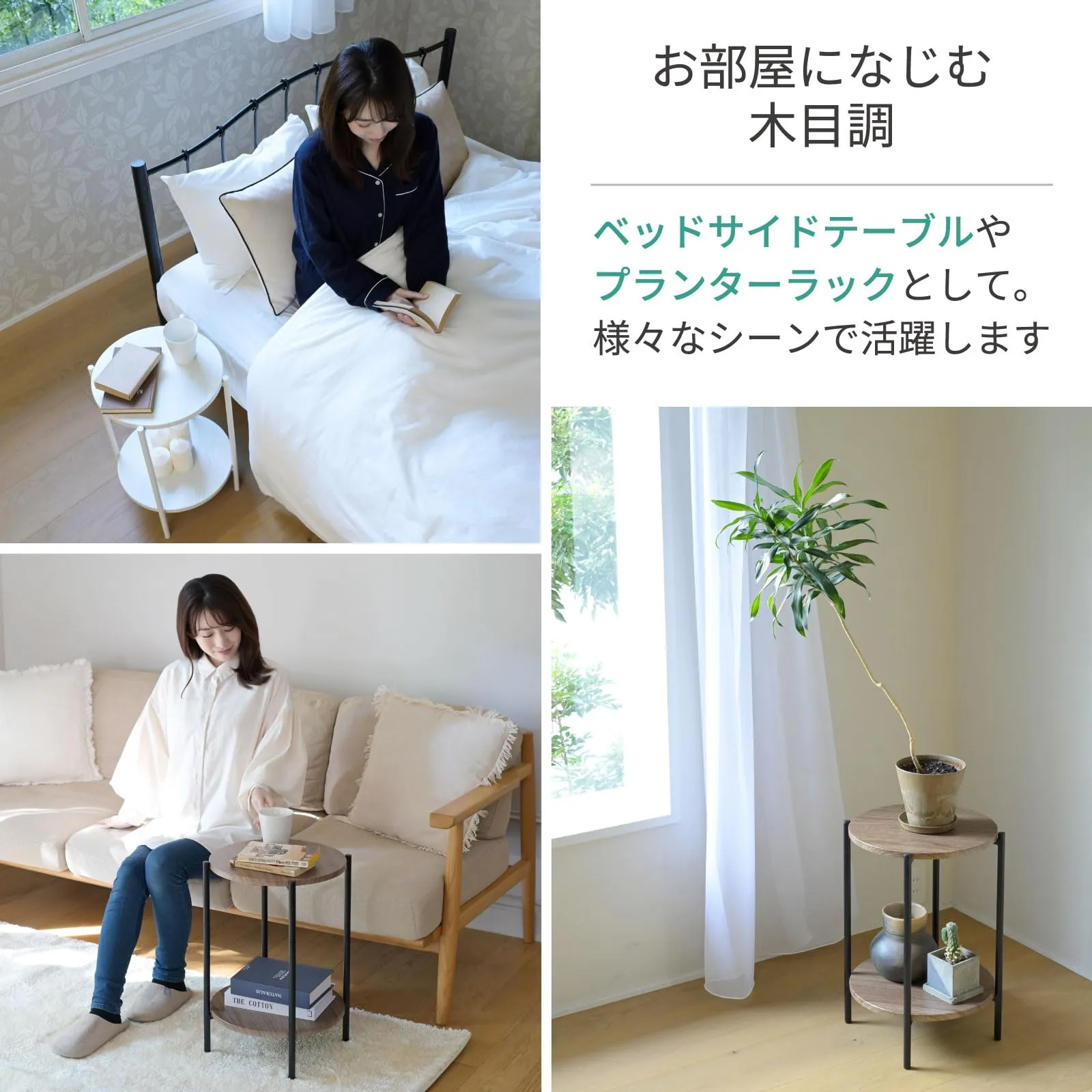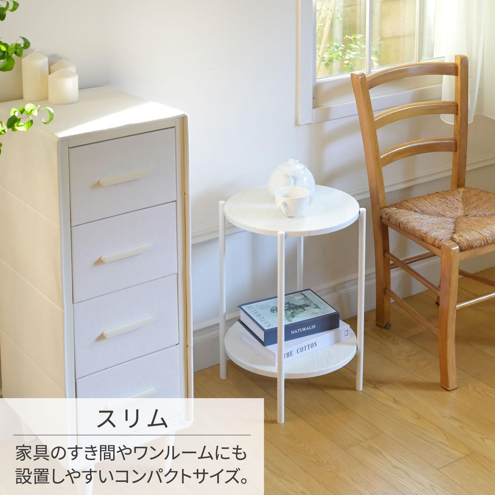 【コンパクトなテーブル】ソファ横やベッドサイドにもぴったりのスリムなサイドテーブルです。飲み物や本を置いたりはもちろん、観葉植物や小物のディスプレイラックとしても使えます。