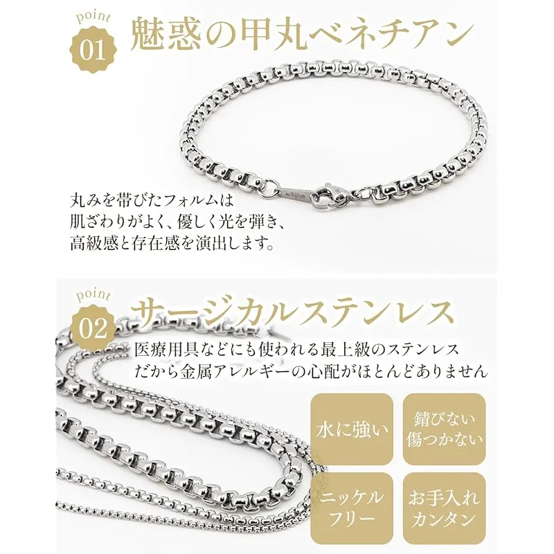【商品説明】 シンプルでかっこいい甲丸ベネチアンチェーンのメンズ&レディースブレスレットです。 細い1.5mmチェーンはしなやかに、太めの4mmチェーンは個性的に男性でも女性でもフィットします。長さのバリエーションも豊富にご用意いたしました。