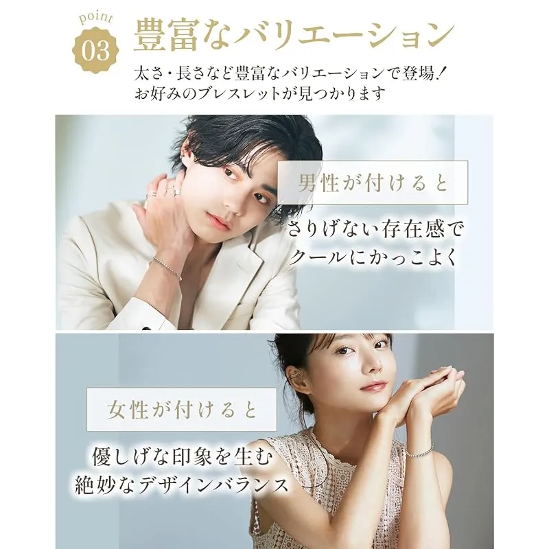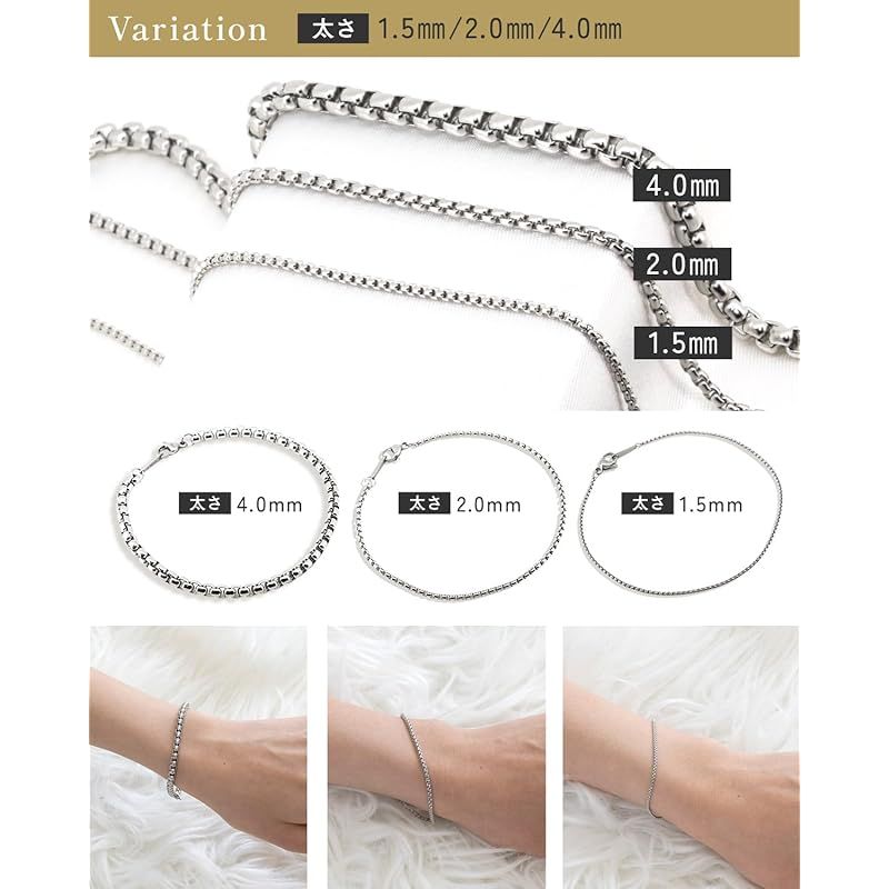 【 豊富なバリエーション 】チェーンの太さ1.5mm、2mm、4mm、チェーンの長さ18cm、19cm、20cm、21cm、22cmと15種類のバリエーションをご用意しています。お好みのチェーンを手首の太さに合わせてお選びいただけます。(一般的な男性の手首周りのサイズは平均17cm、女性は平均15cmで、チェーンブレスレットの場合は、手首周りプラス2~4cmがおすすめのサイズです。)細めの1.5mmチェーンから存在感がある太めの4mmチェーンまで3種類の太さ5種類の長さをご用意しています。 ?