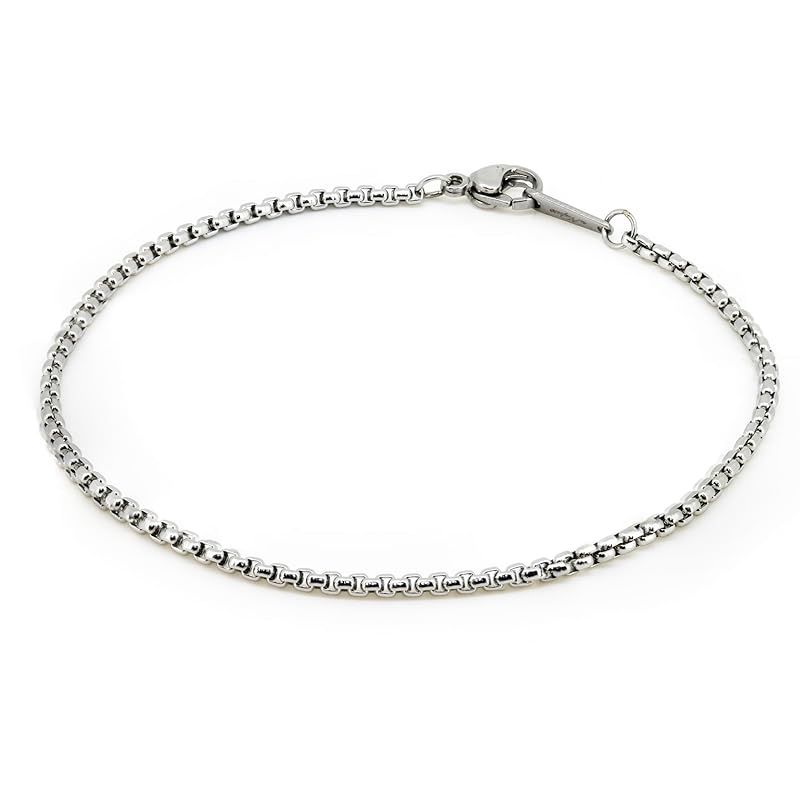【 人気の甲丸ベネチアンチェーンブレスレット 】ボックス型のパーツ丸く加工し交互に組合せたチェーンのブレスレット。各ピースが小さいので直線的でスタイリッシュなチェーンでを与えます。各ピースを丸く加工しているので強度が強く力が加わっても切れにくい。また絡まりにくく取り扱いが簡単です。男性、女性、年齢、シーンに関わらず、カジュアルにもフォーマルにもご使用いただけます。流行に左右されないデザインで魅力あるメンズブレスレット・レディースブレスレットです。 ?