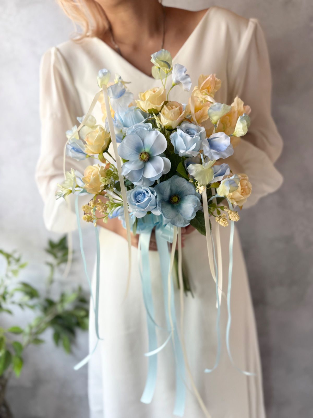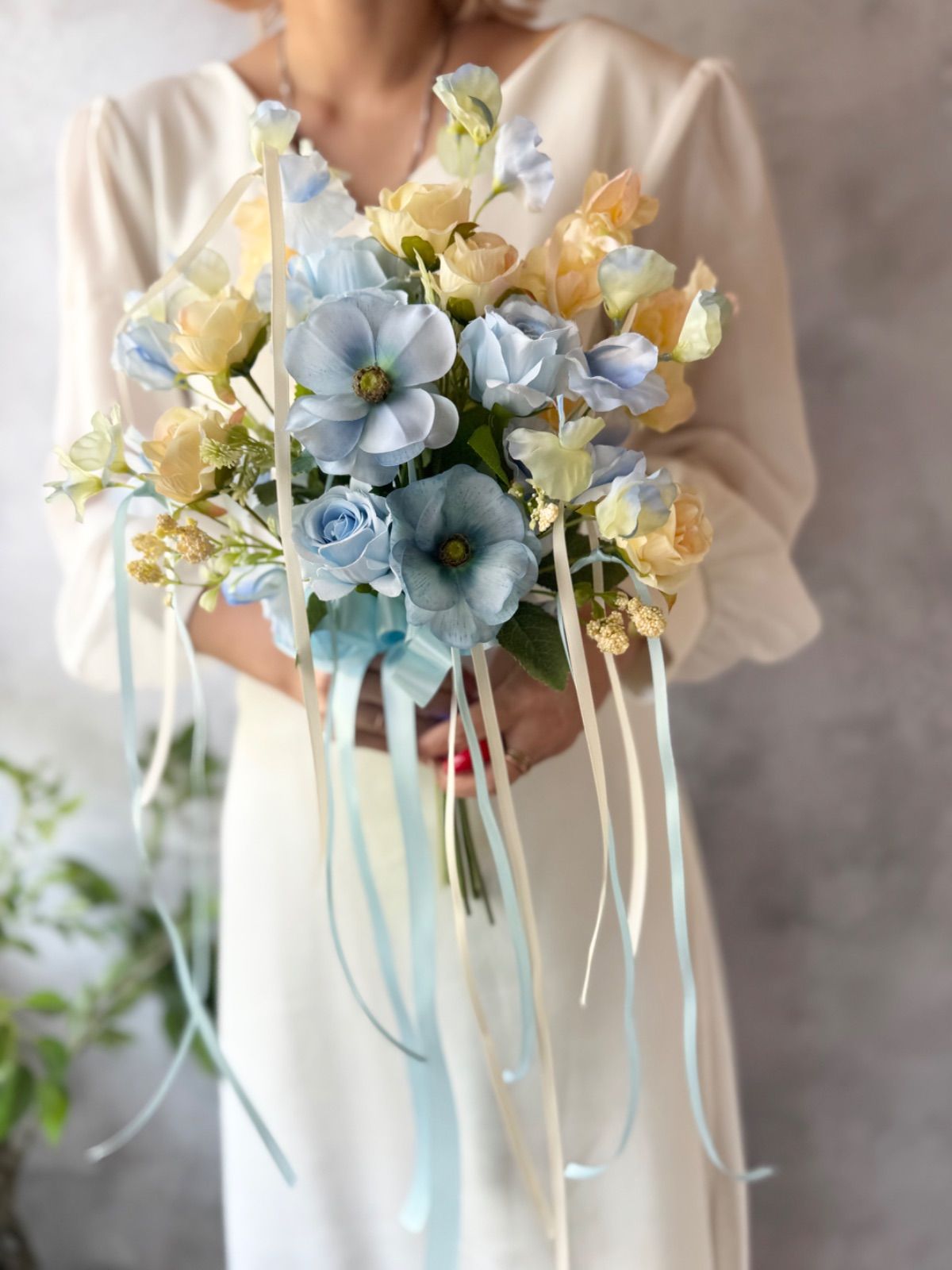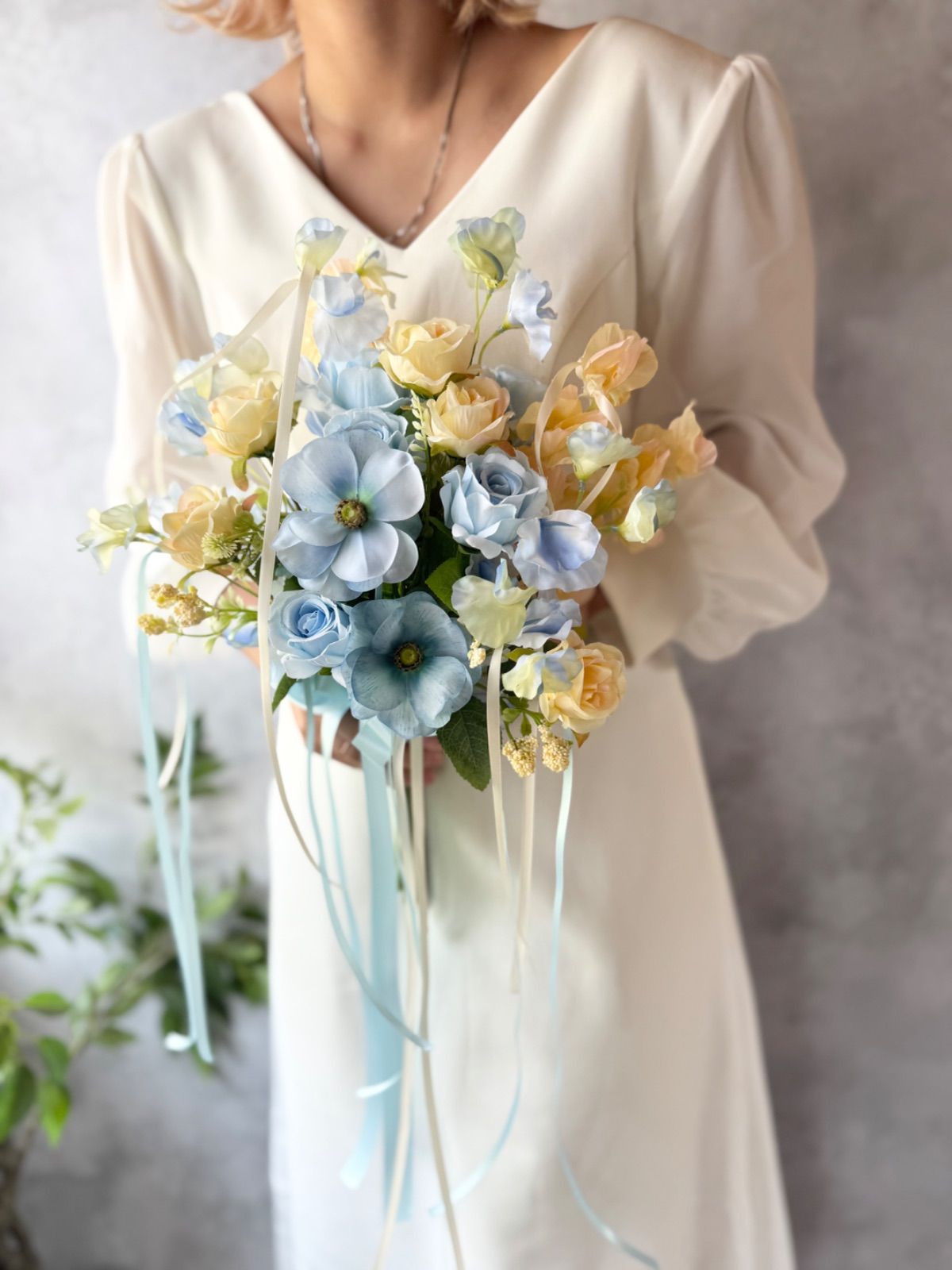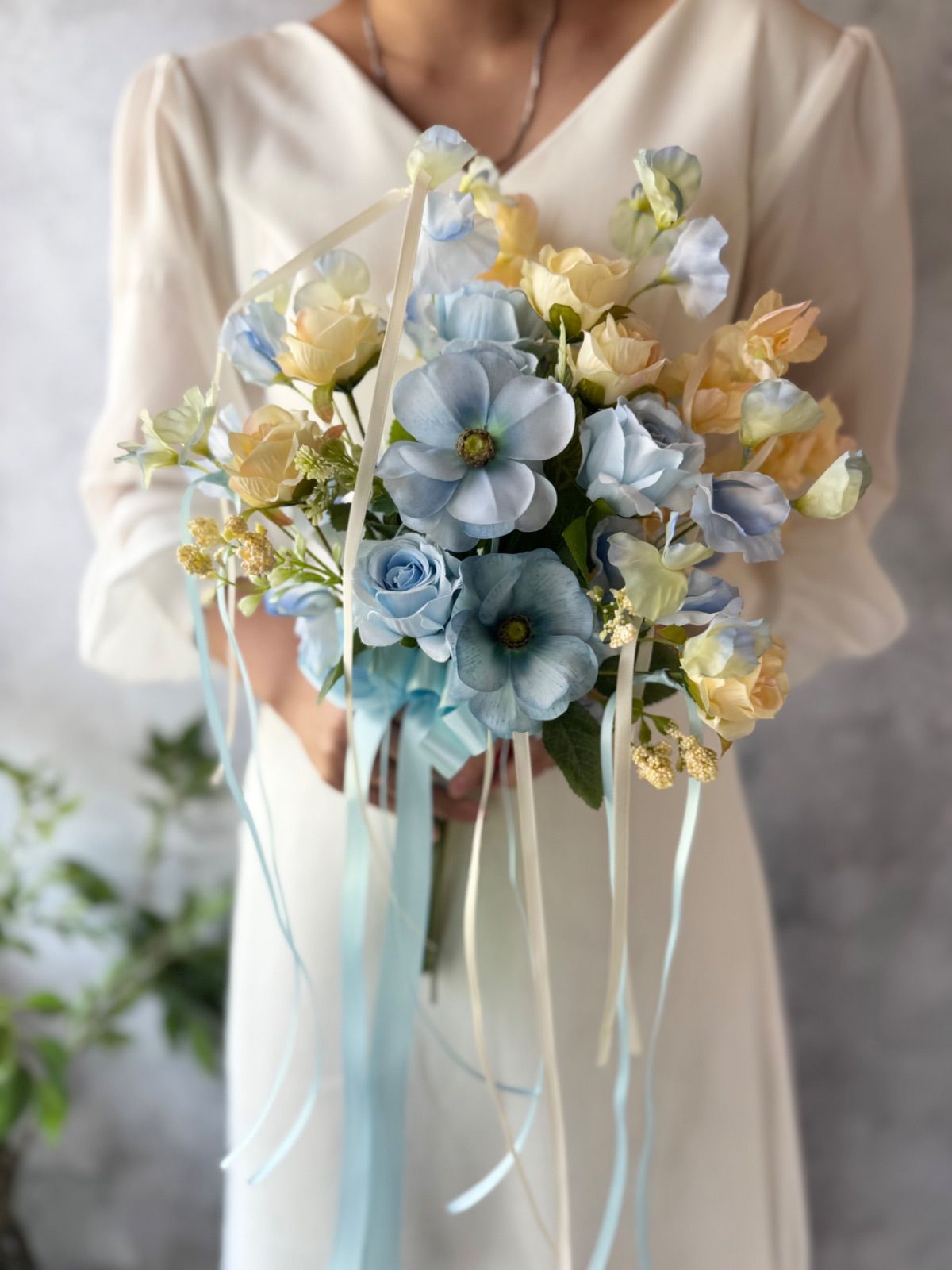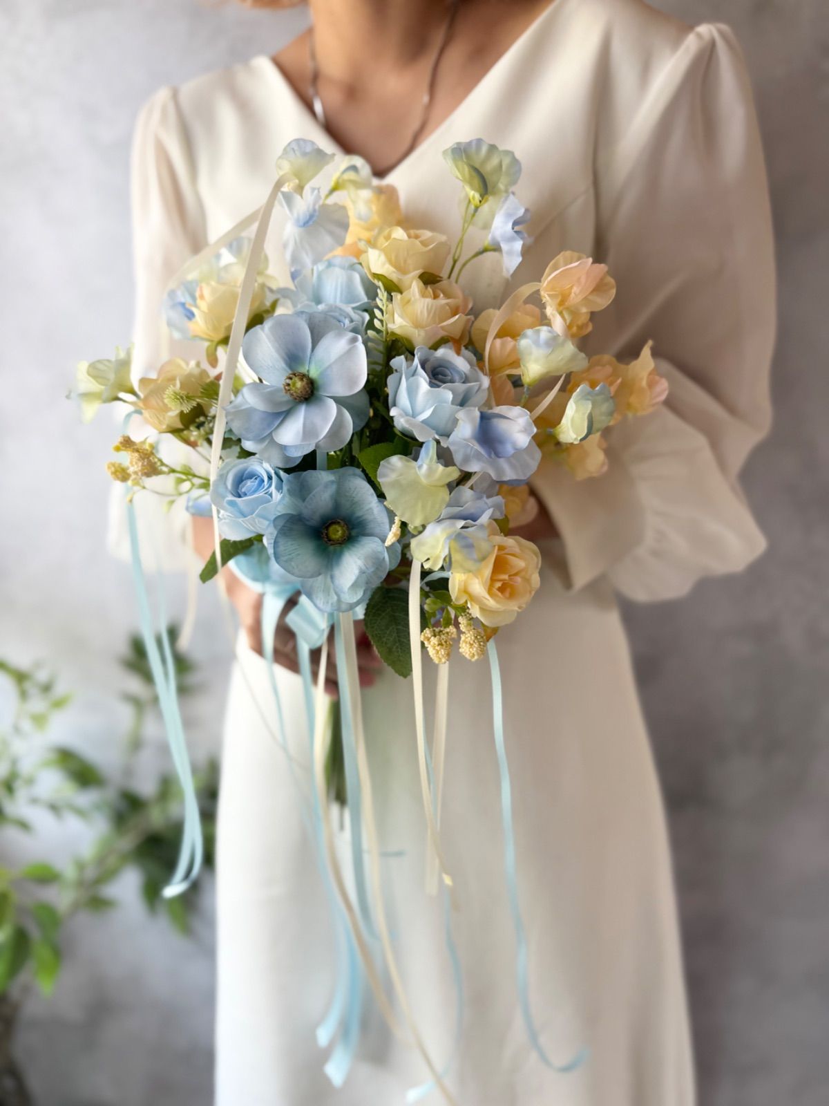 爽やかなブルーフラワーに、柔らかなイエローやアイボリーを添えることで、甘さと透明感を両立した優しい印象に仕上げました。