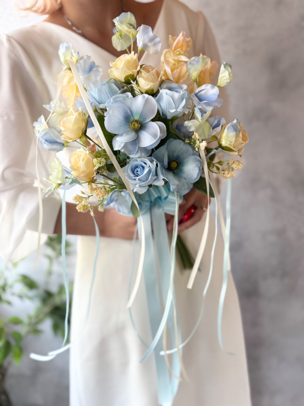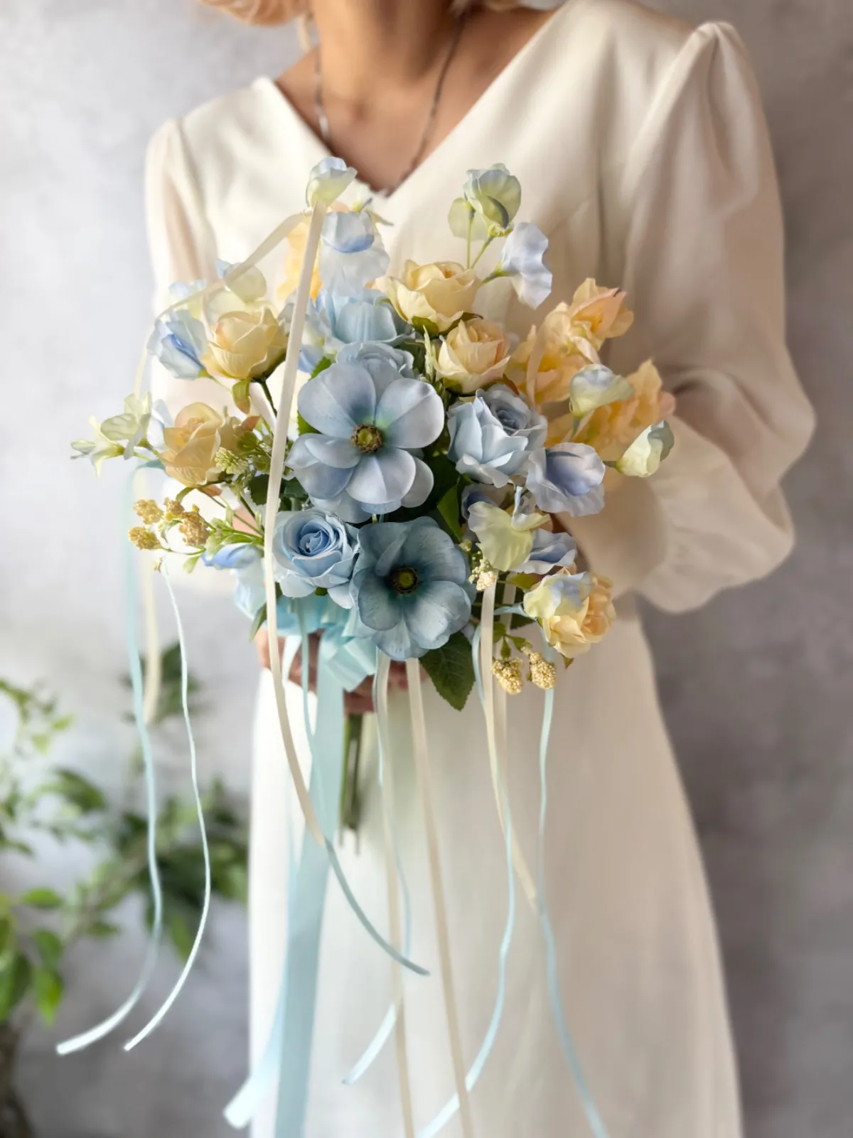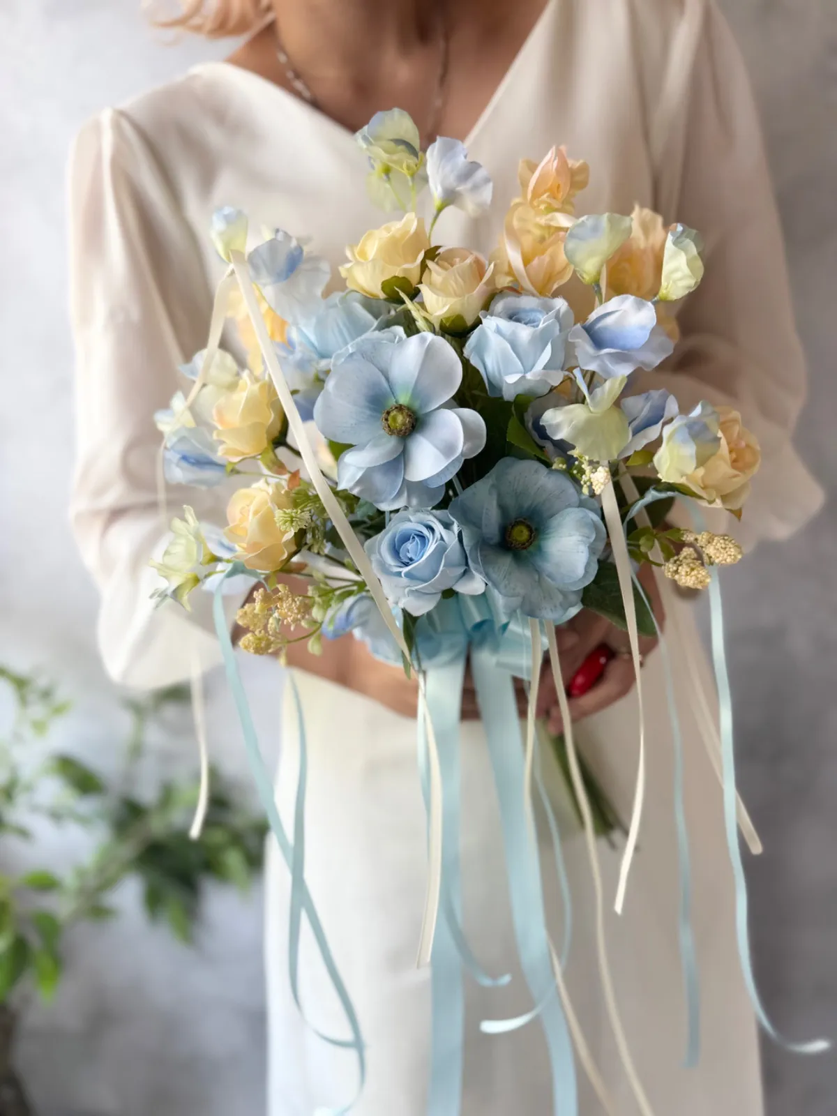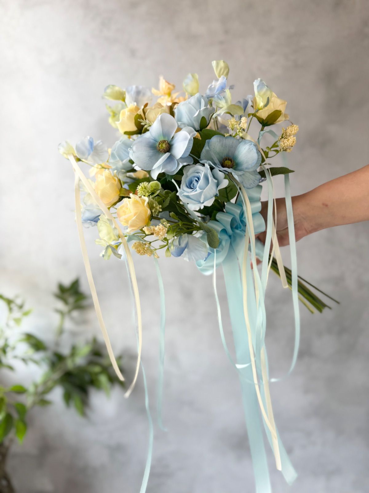 爽やかなブルーフラワーに、柔らかなイエローやアイボリーを添えることで、甘さと透明感を両立した優しい印象に仕上げました。
