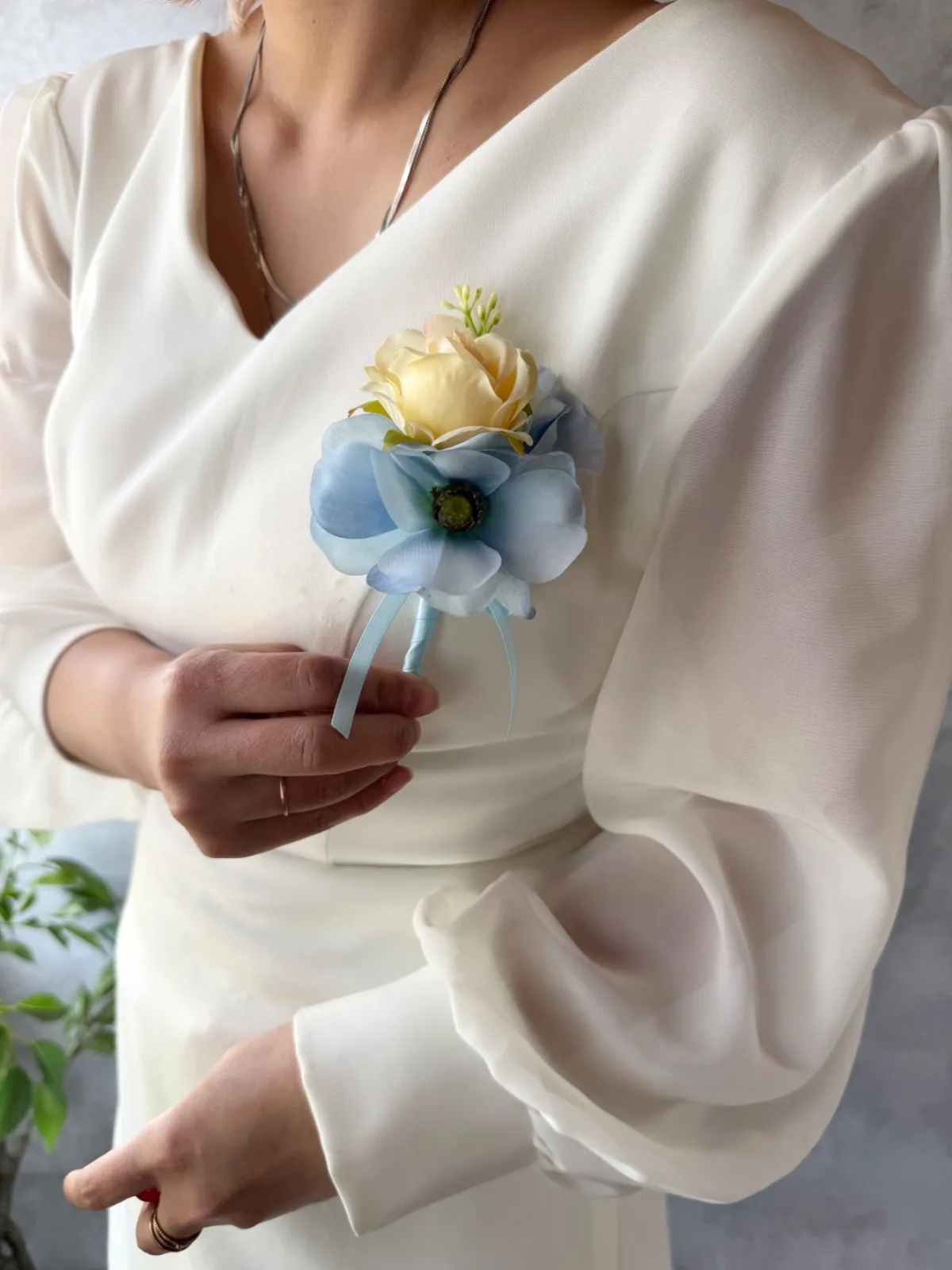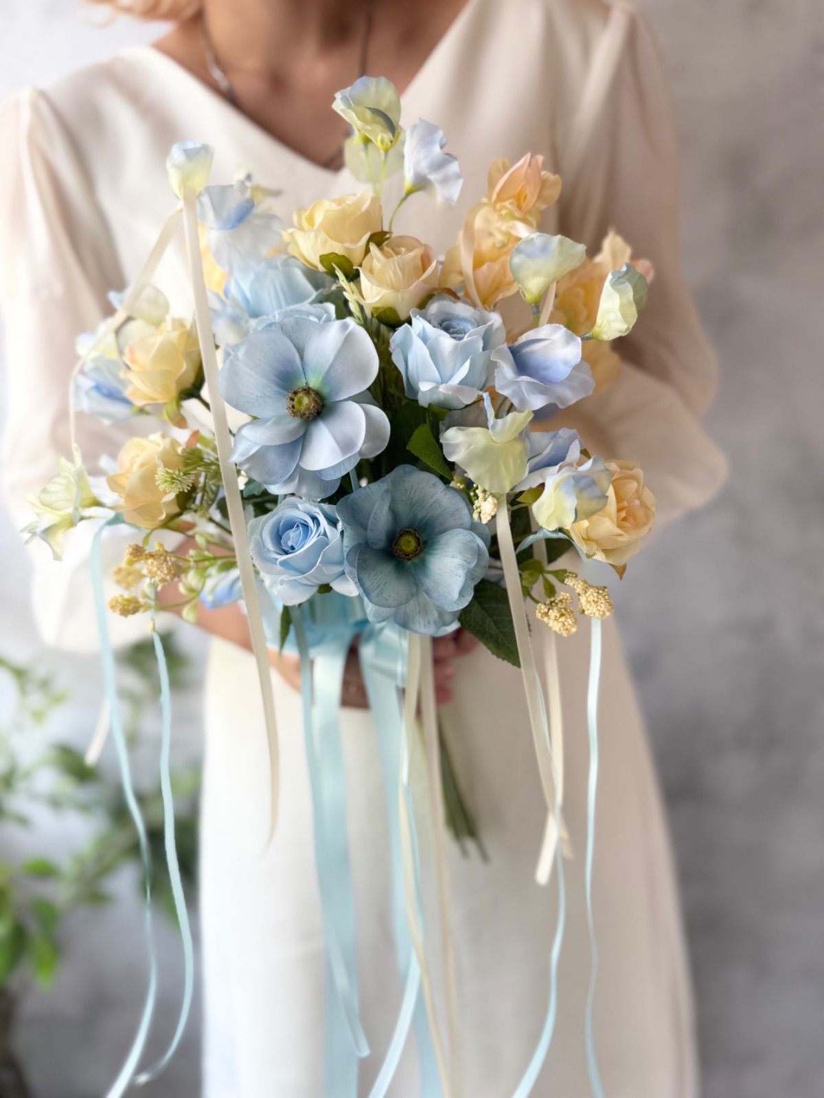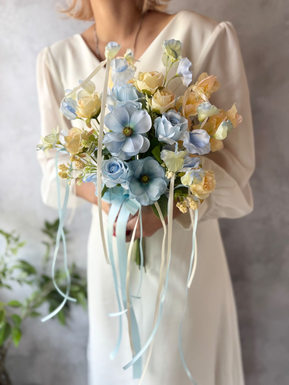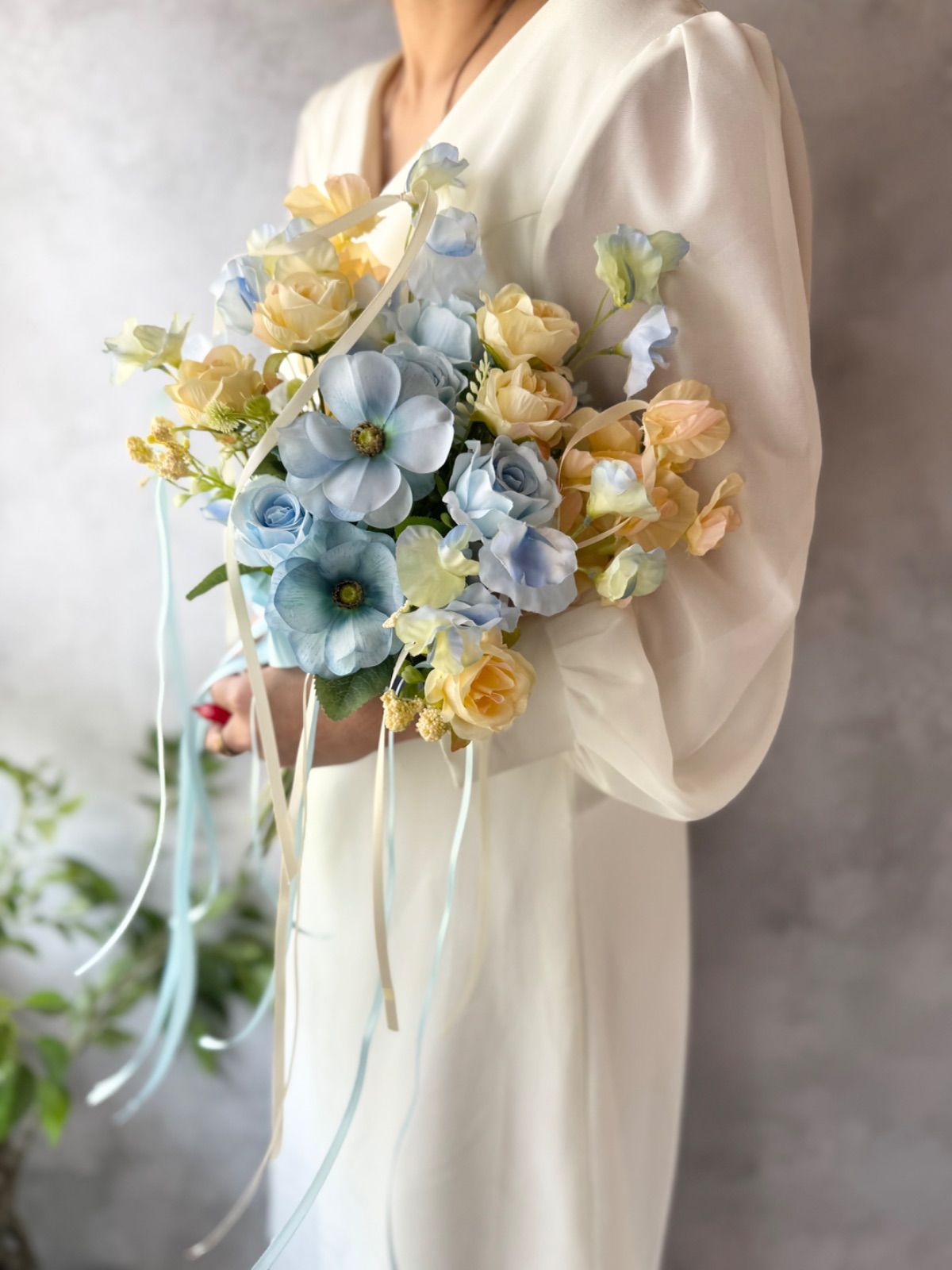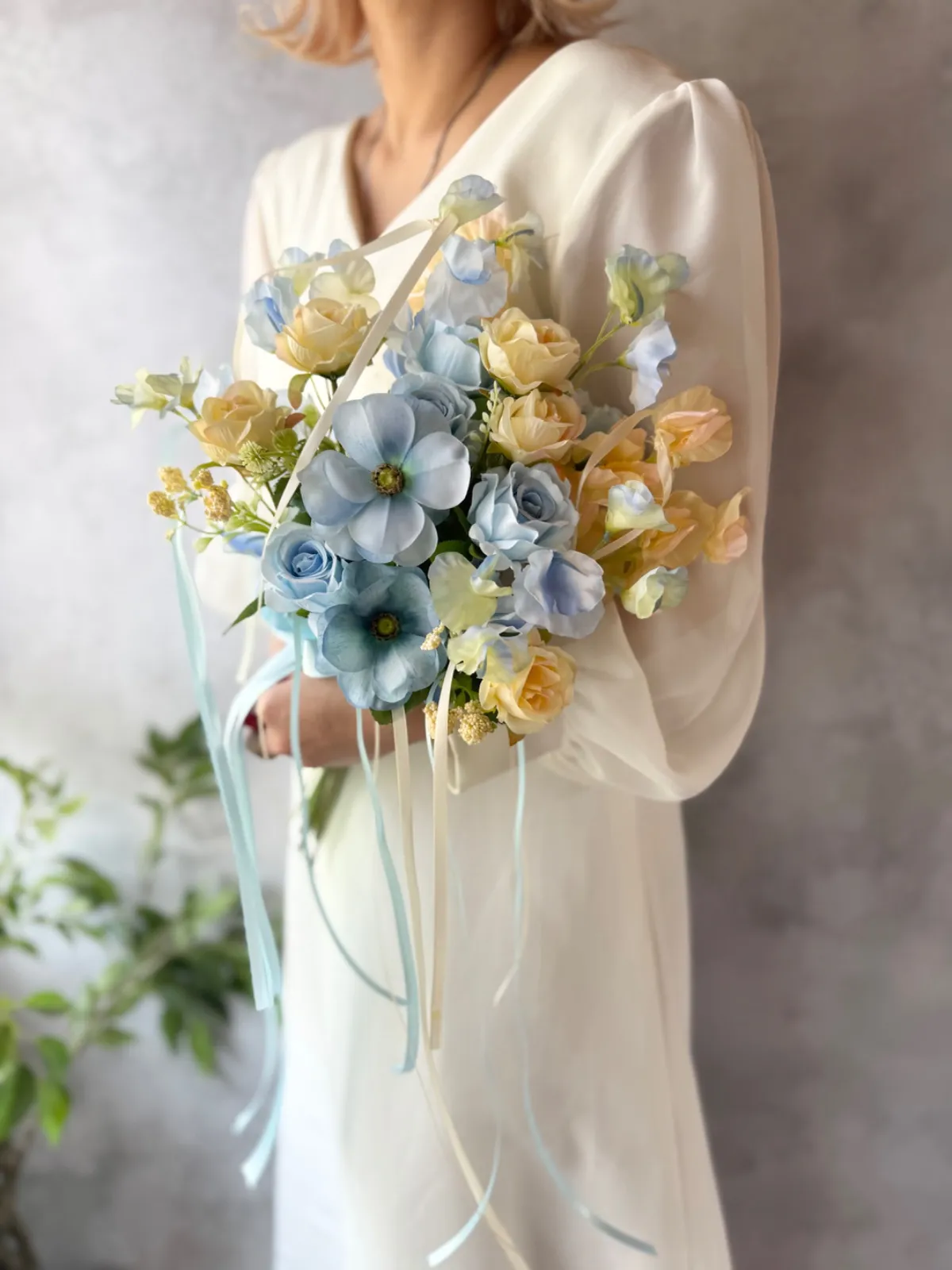 爽やかなブルーフラワーに、柔らかなイエローやアイボリーを添えることで、甘さと透明感を両立した優しい印象に仕上げました。