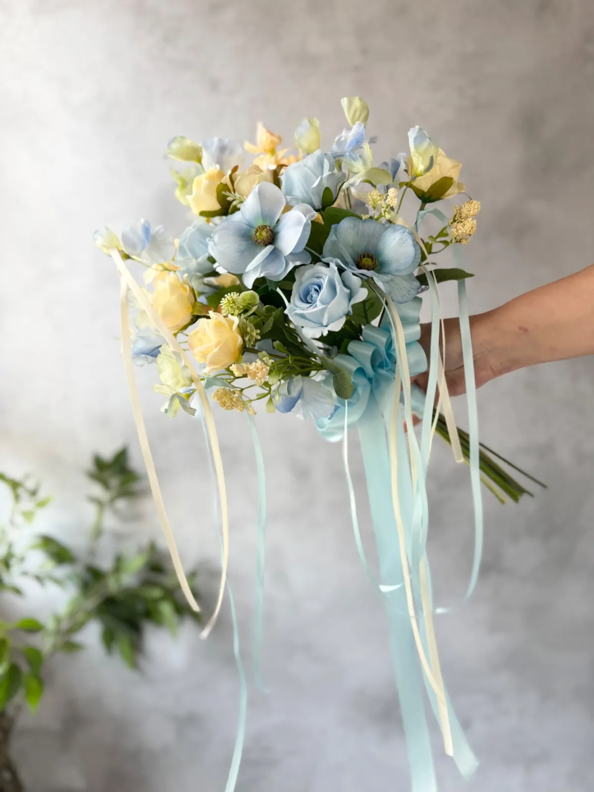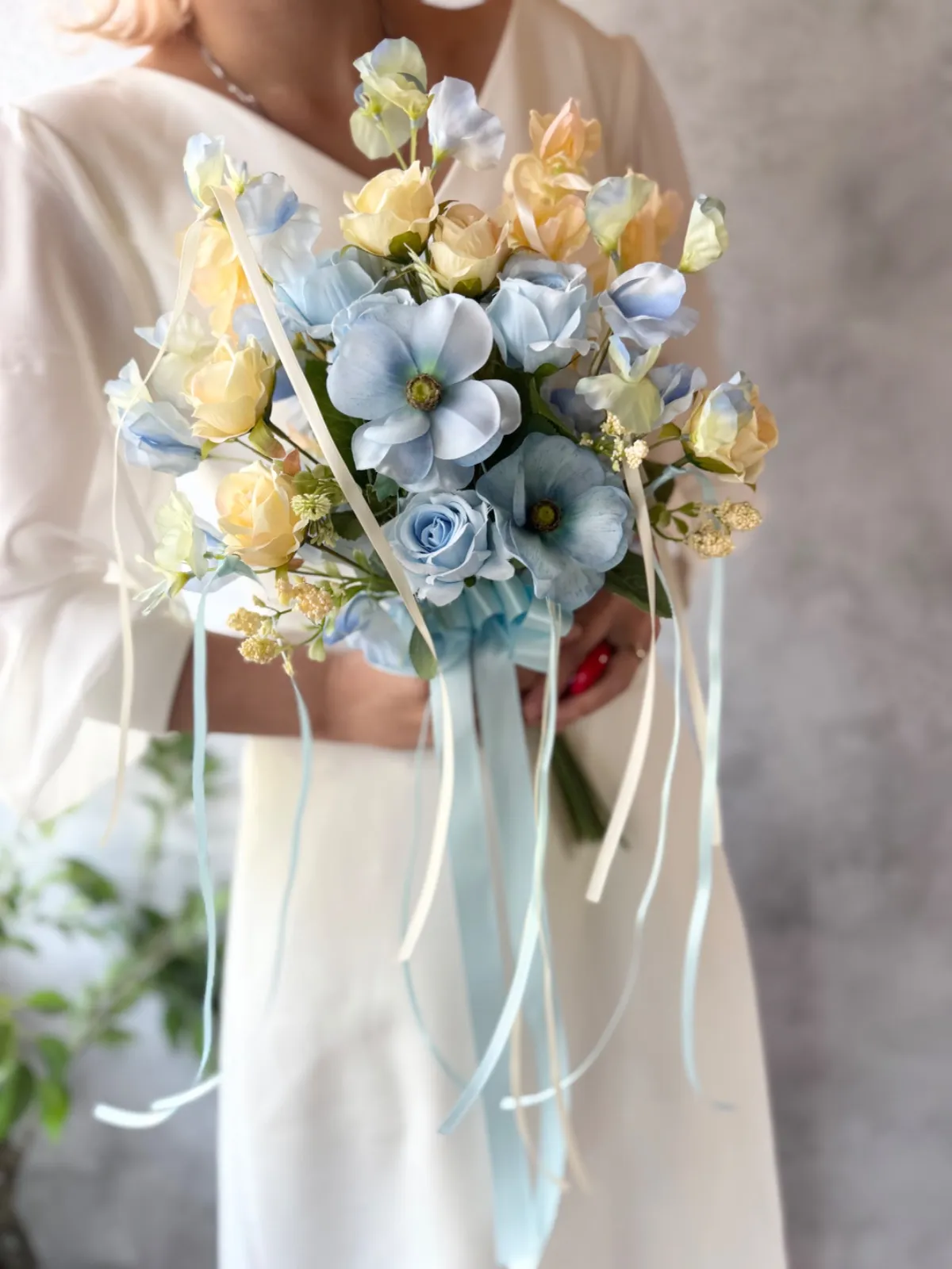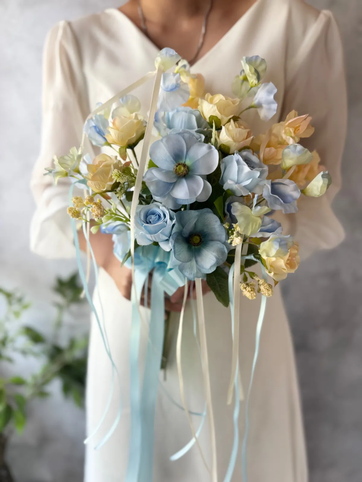 淡いブルーとクリームイエローをやさしく組み合わせた、ナチュラルで可憐なガーデンテイストのクラッチブーケ。