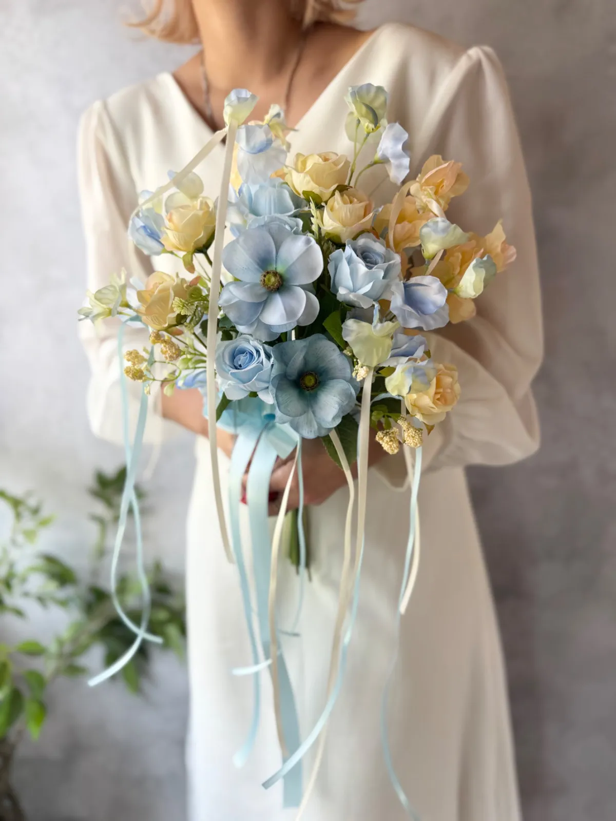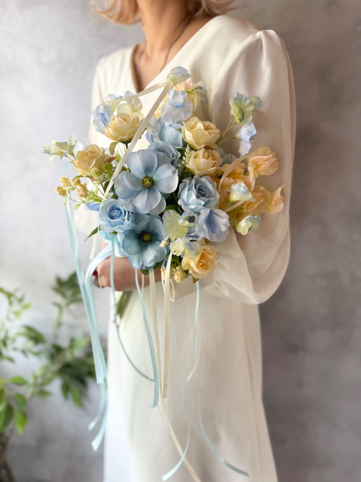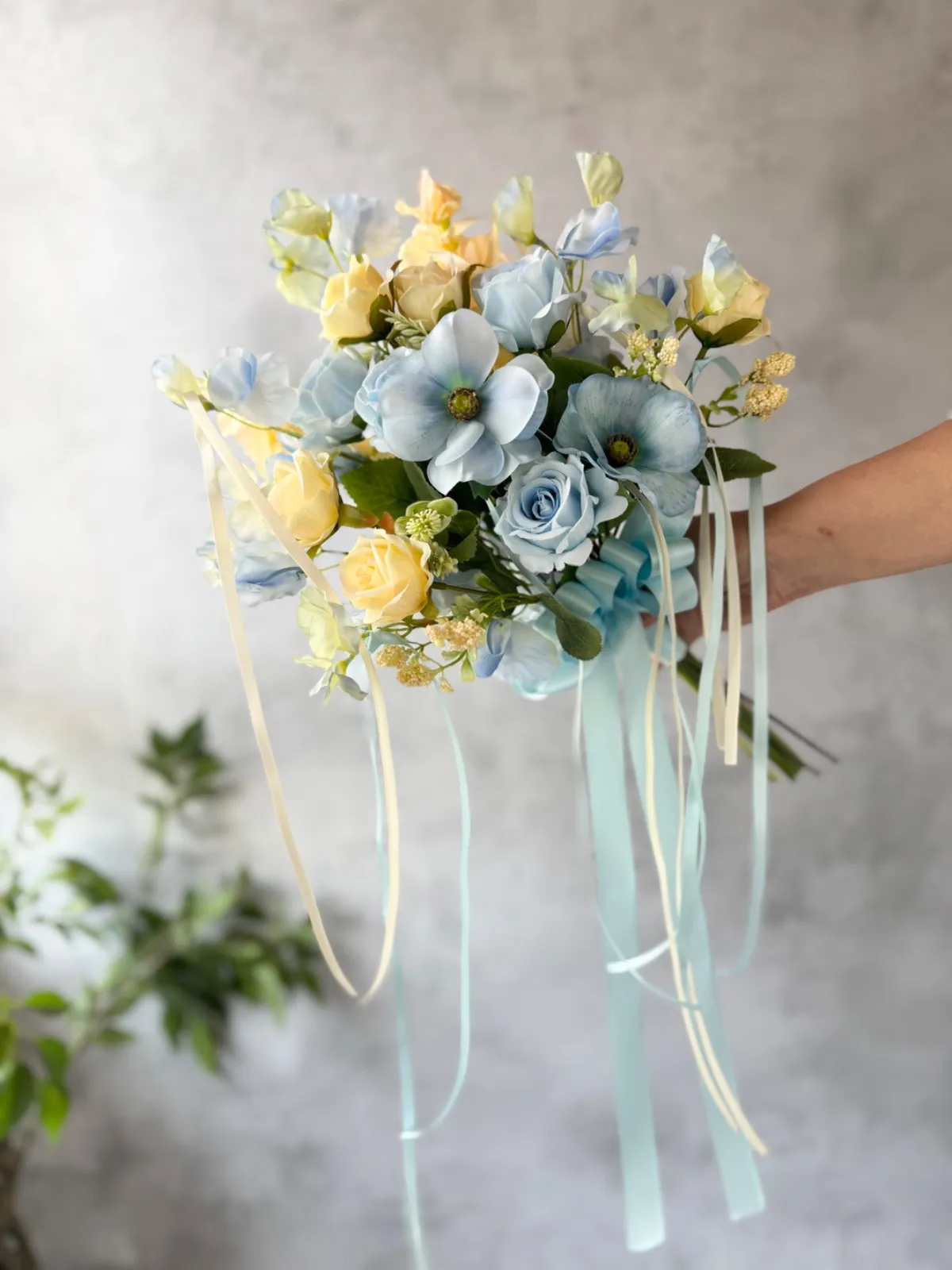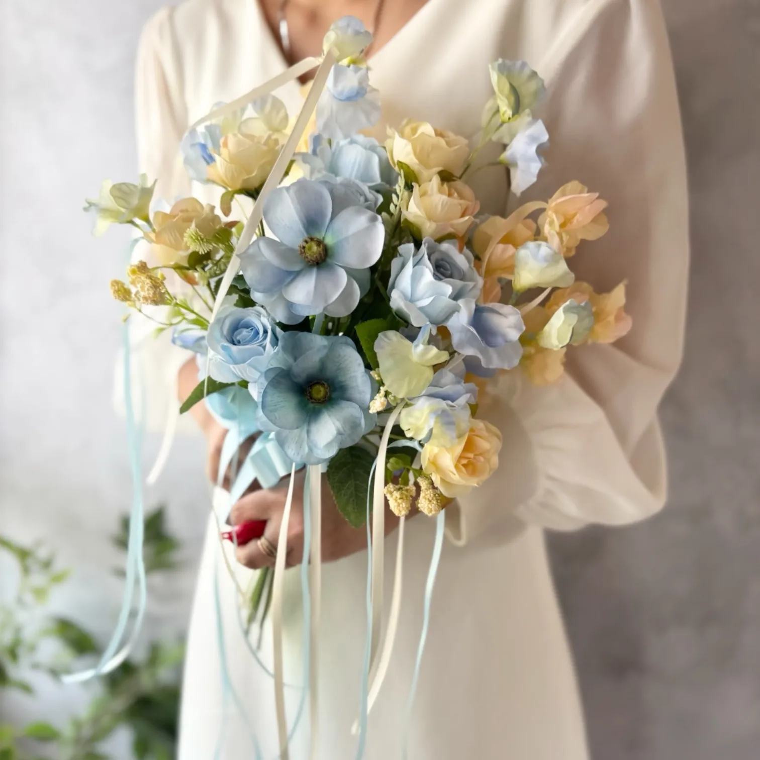 淡いブルーとクリームイエローをやさしく組み合わせた、ナチュラルで可憐なガーデンテイストのクラッチブーケ。