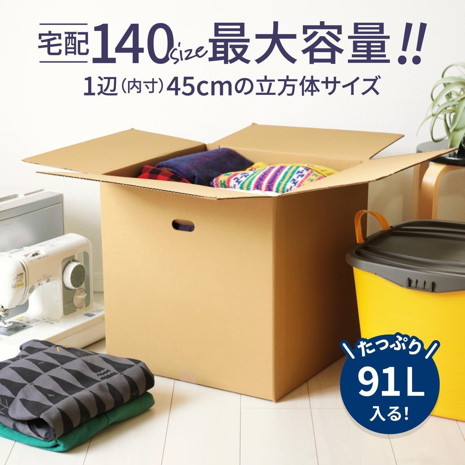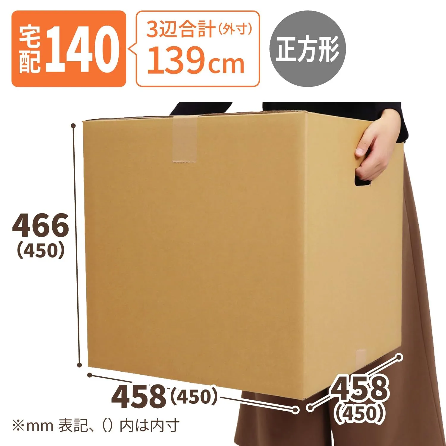 【140サイズ対応の立方体ダンボール】長さと幅と深さが同寸法の立方体型のダンボール箱。3辺合計は139cmで、宅配140サイズに対応しています。容量は91Lほどで、140サイズの中で最大容量の箱です。