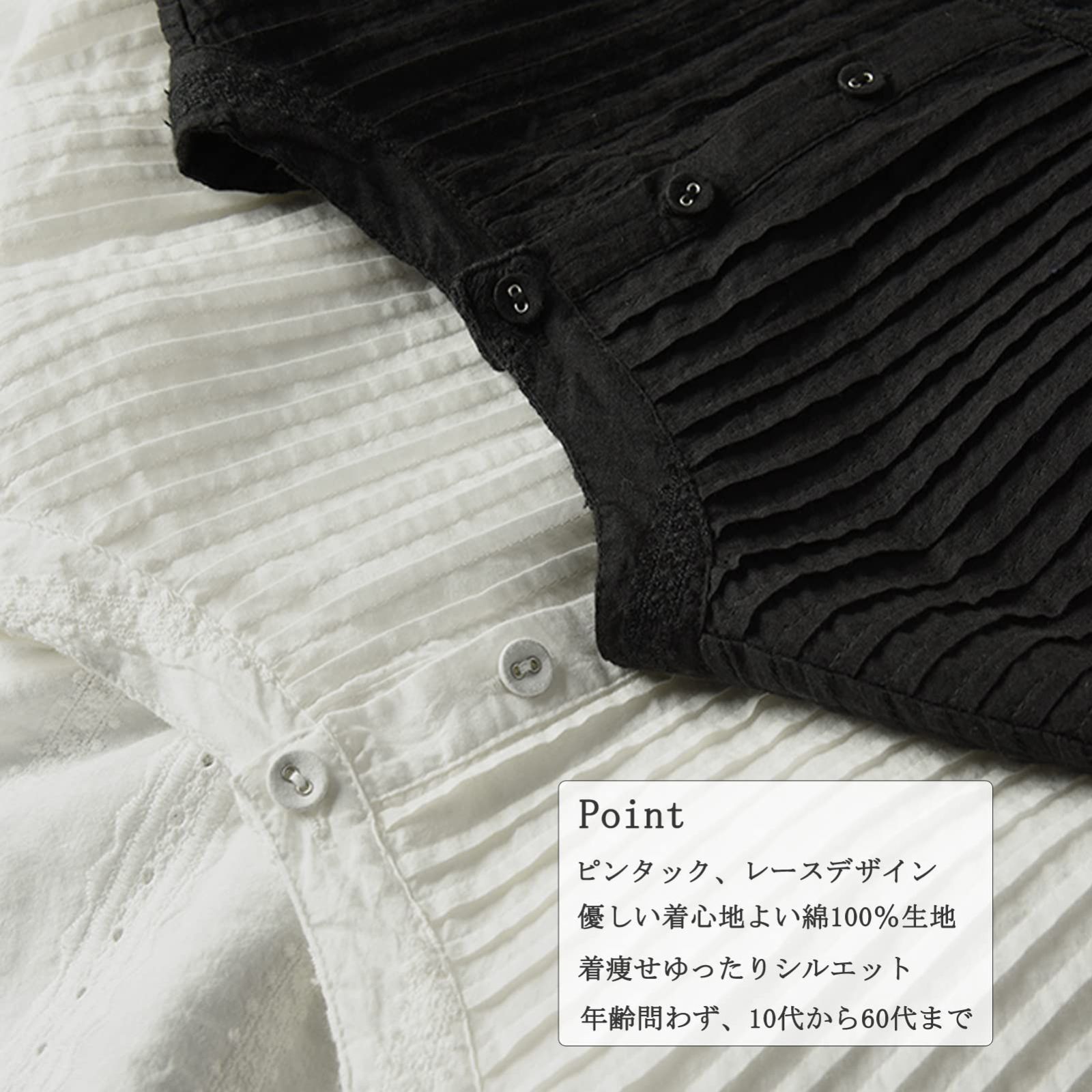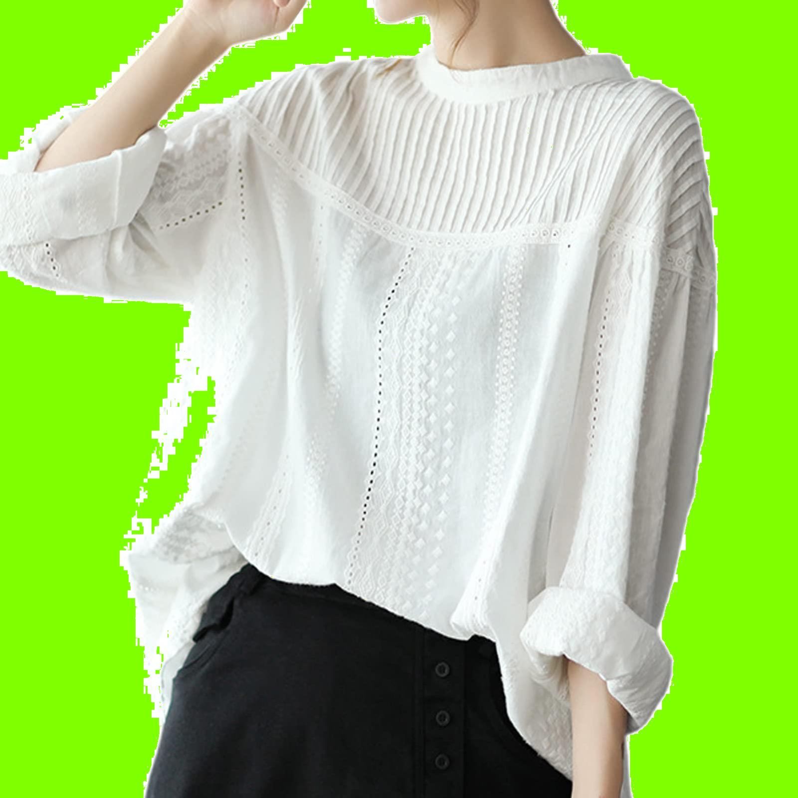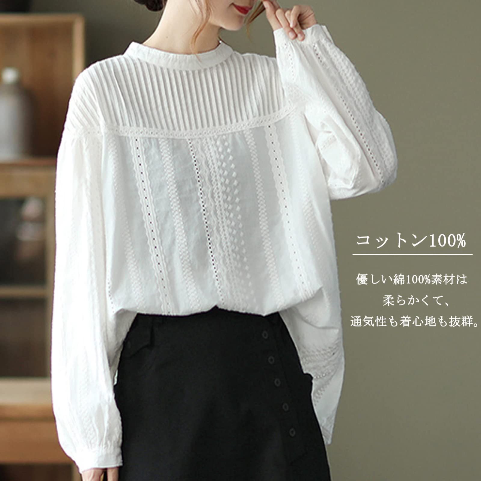 [YY-Natuhi] ブラウス シャツ トップス レディース レース ピンタック 綿100% 長袖 カジュアル おしゃれ きれいめ ゆったり デート オフィス 通勤 普段着 部屋着 春 夏 秋 Free Size