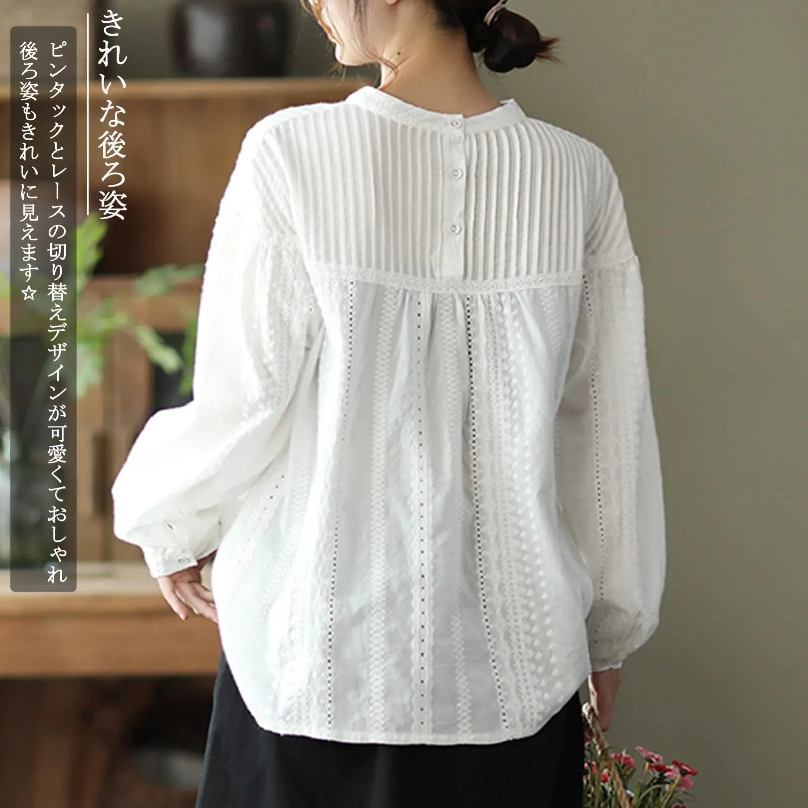【後ろ姿もきれい】ピンタックとレースの切り替えデザインが可愛くておしゃれです。後ろ姿もきれいです。ゆったりシルエットで着痩せ効果も期待できます。