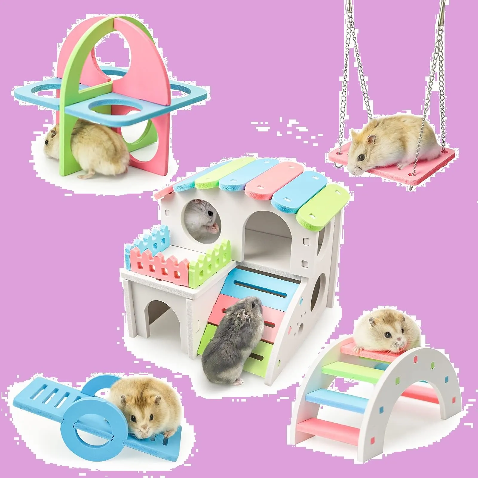 小屋 かわいい ペットスポーツ 遊び場 ブランコとPVCシーソー レインボーブリッジ ストレス解消 玩具 面白い 運動不足解消 おもちゃ 小動物用 おしゃれ ケージ ハムスター 複数カラー ハムスター ハウス (H03) 5点セット