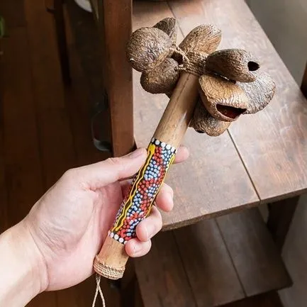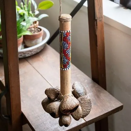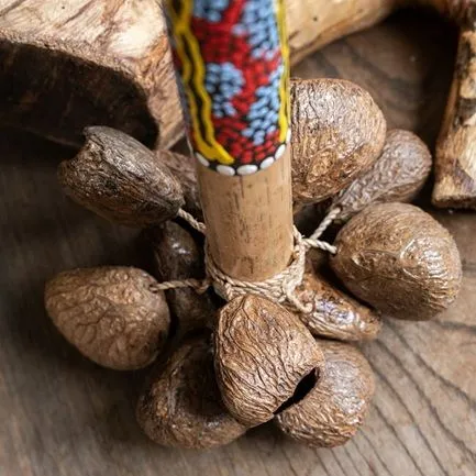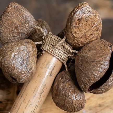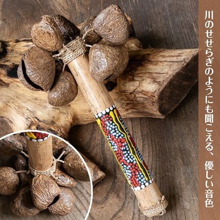使い方はいたって簡単。竹でできた柄を持って振ると木の実がぶつかってガラガラ♪カラカラ♪ 優しい音色