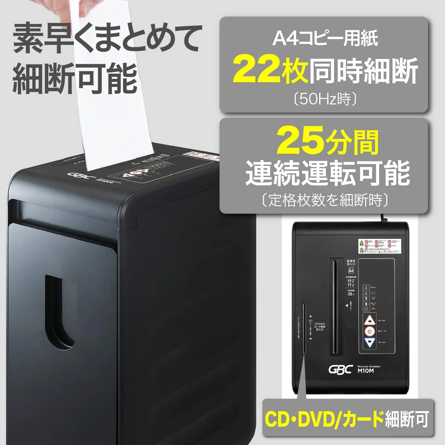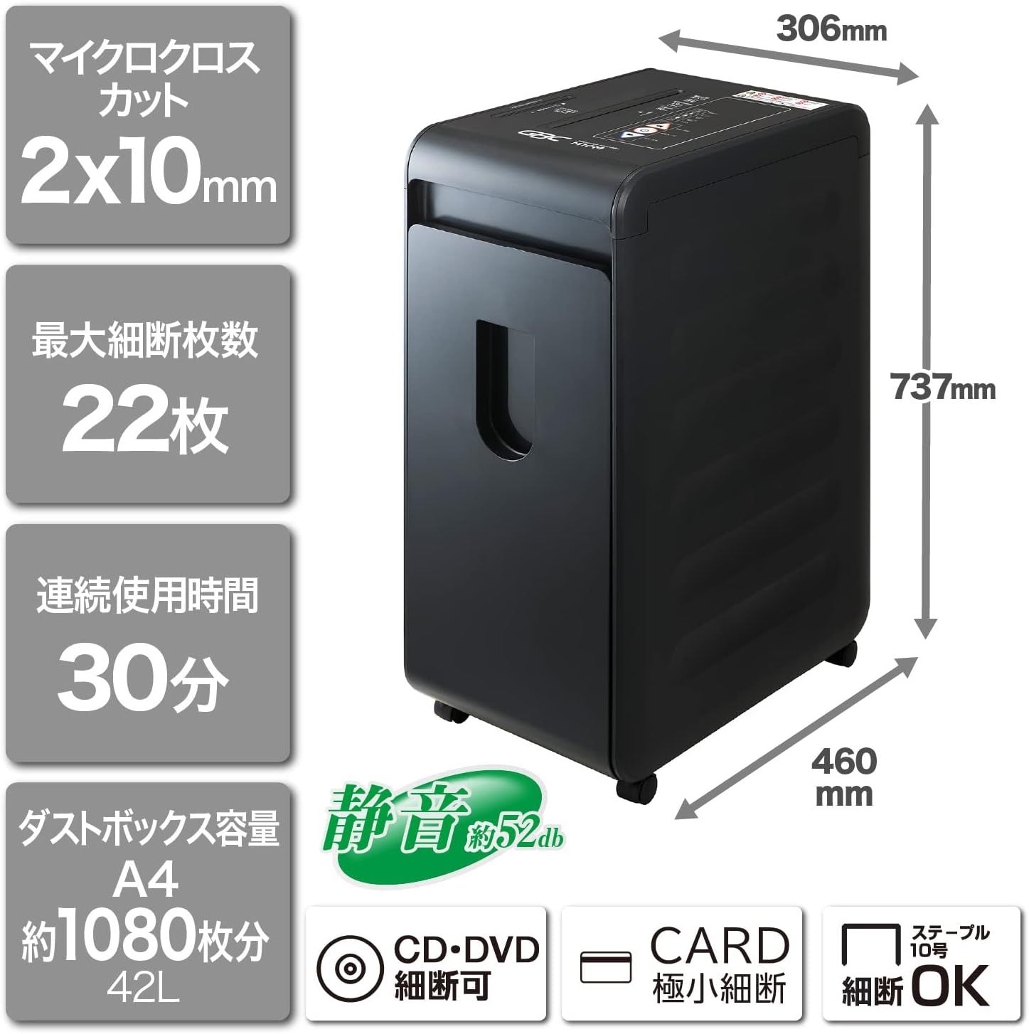【商品の状態】 ・新品未使用 箱ダメージ品となります。 ・箱ダメージによる商品への影響はなく傷や汚れのないきれいな状態です。 ・通電、各ボタン動作正常です。 ・外装箱に破れがあります。 ・極小細断 最大細断枚数22枚 ・CD/DVD/プラスチックカードも細断可能 ・ホチキス対応 ・ダストボックス大容量42L ・ A4/約1080枚収容