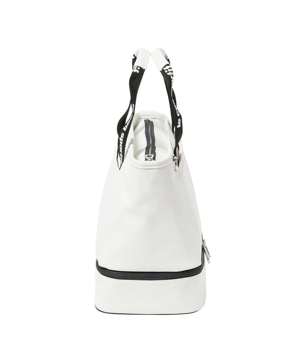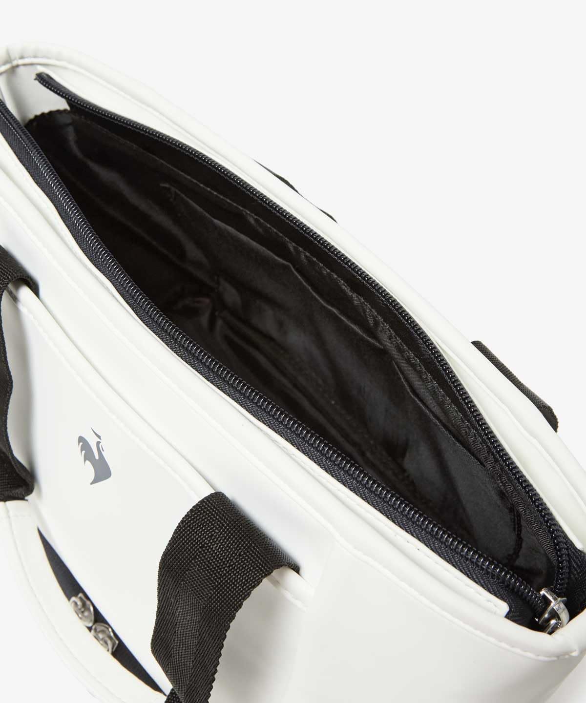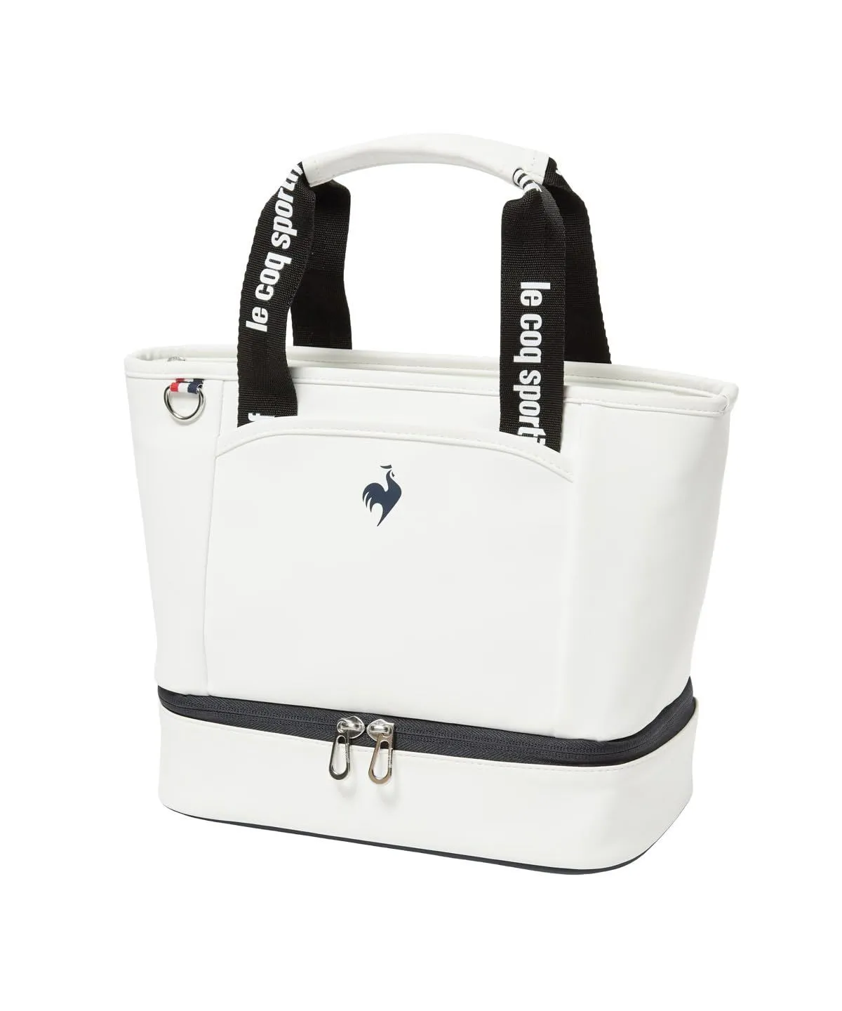 下部収納スペースに保冷機能裏地を使った二層式カートポーチ。上下二層に区分けしており、上部はラウンド中の小物入れ、下部は保冷機能裏地で500ml2本程度のペットボトルやクーリングアイテムが収納可能。大きく開く開口部分は中身も見やすく、内容物の出し入れも容易。