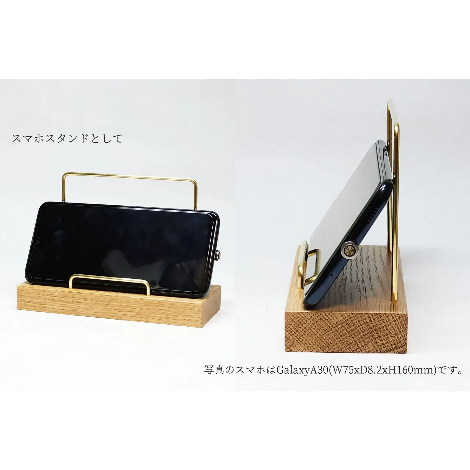 【作品説明】 意外にもこれまで作ってませんでしたが、横置きできる王道のスマホスタンドです。 サイズ的にポストカード(サイズ148x100mm)も置けるスタンドとなっています。 スマホスタンドとしては横向きに置けるので、充電しながらムービーを見たりするのに便利です。 安定感があり、幅広いサイズのスマホに対応できます。 ポストカードとしては横置き、縦置き両方に対応できるようにデザインしていますので、 様々な種類のカードを置くことができます。カレンダーやお気に入りの絵葉書を飾るのにオススメです。 真鍮とホワイトオークは共に無垢の素材なので、経年変化とともにずっとお使い頂ける作品となっています。 プレゼントにもおすすめです。