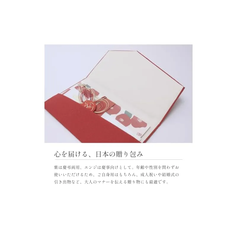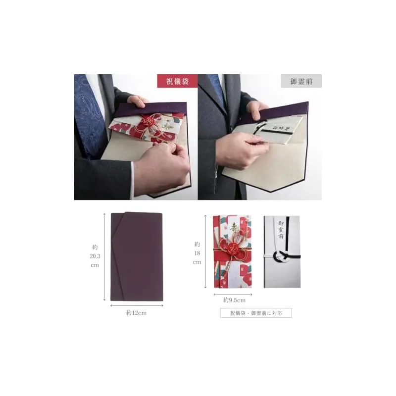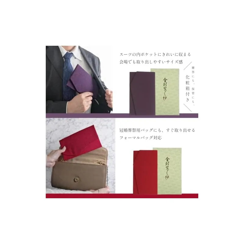 【使いやすい差し込み式】金封を差し込むだけで簡単に使用できる"差し込みタイプの袱紗(ふくさ)"です。 折りたたむ手間がなく、初めて袱紗を使う方にもおすすめです。 ご祝儀袋や香典袋をそのまま持ち歩くよりも、上品でフォーマルな印象を与えます。