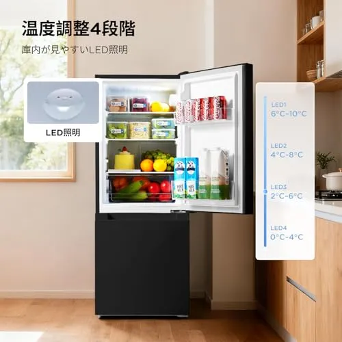 【4段階の温度調節と、明るいLEDライト】夏場や食材に合わせて、冷やし具合を細かく調整可能。省エネを意識しながら、美味しさを長持ちさせます。庫内全体を明るく照らすLEDライトで、奥にしまった小物も見逃しません。