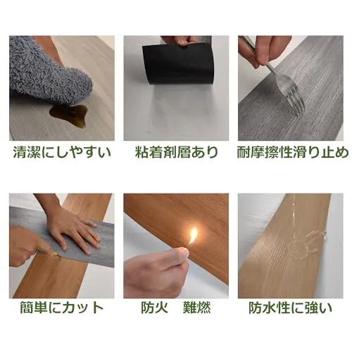 【防水・滑り止め】フロアタイル表面には耐久性に優れた特殊クリア加工・抗菌加工に加え、防水、表面についた汚れは濡れ雑巾などでふき取ってください。滑りにくいです。キッチン、トイレ、子供部屋、リビング、ダイニング、玄関、店舗、脱衣所、洗面台、カフェ、オフィスなどでお使いおすすめます。