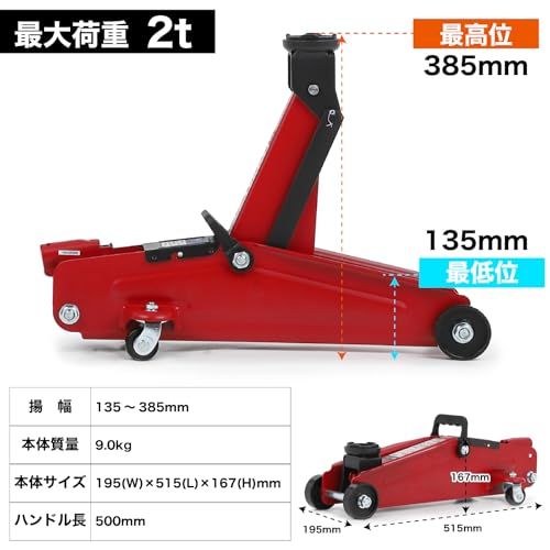 BAL(大橋産業) 車用 油圧 フロアージャッキ 2t 【最高値 385mm 最低値 135mm】スローダウン機構 軽自動車 小型車 乗用車 No.2101